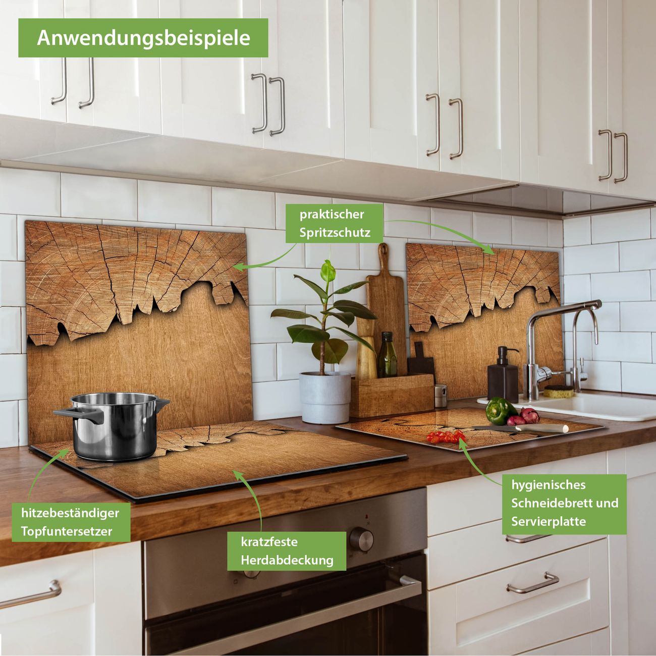 VIELSEITIG: Die Ceranfeldabdeckung ist vielseitig einsetzbar: ob als Spritzschutz hinter dem Herd für Ihre Küche oder als Glas Schneidebrett als hygienische und geruchsneutrale Unterlage. Sie können ebenfalls heiße Töpfe und Pfannen bis 100°C auf der Herdplattenabdeckung abstellen. Sie erhalten ein Multitalent für Ihre Küche. Die banjado Herdabdeckplatte aus Glas mit Motiv Holz verdeckt mit einem schönen Motiv Ihr Ceranfeld bzw. Ihren Induktionsherd. Die Herdabdeckplatte ist vielseitig einsetzbar und passt sich dabei Ihrem Einrichtungsstil an. DESIGN: Die Herdabdeckung Holz besteht aus hochwertigem, gehärtetem Glas mit einem unserer zahlreichen Motive. Sie haben die Wahl zwischen verschiedenen Maßen von einteiligen, zweiteiligen und einer dreiteiligen Herdabdeckung. Wählen Sie was zu Ihrer Einrichtung passt! DETAILS: Die Herdabdeckplatte ist vielseitig einsetzbar. Die Ecken sind für mehr Sicherheit dezent abgerundet, das Glas ist gehärtet. Sie erhalten separate Gummi Abstandshalter, damit Ihre Abdeckung rutschfest auf dem Herd steht. Diese können Sie frei positionieren, sodass die Herdabdeckung perfekt auf Ihrem Ceranfeld sitzt. BANJADO: Wir sind ein kleines Team aus dem Herzen von Sachsen und fertigen jeden Artikel nach Bestellung eigens für Sie an. Sie erhalten also keine preiswerte Importware, sondern Handarbeit. Auf Wunsch sind auch andere Farben und Größen möglich, kontakierten Sie uns gern.