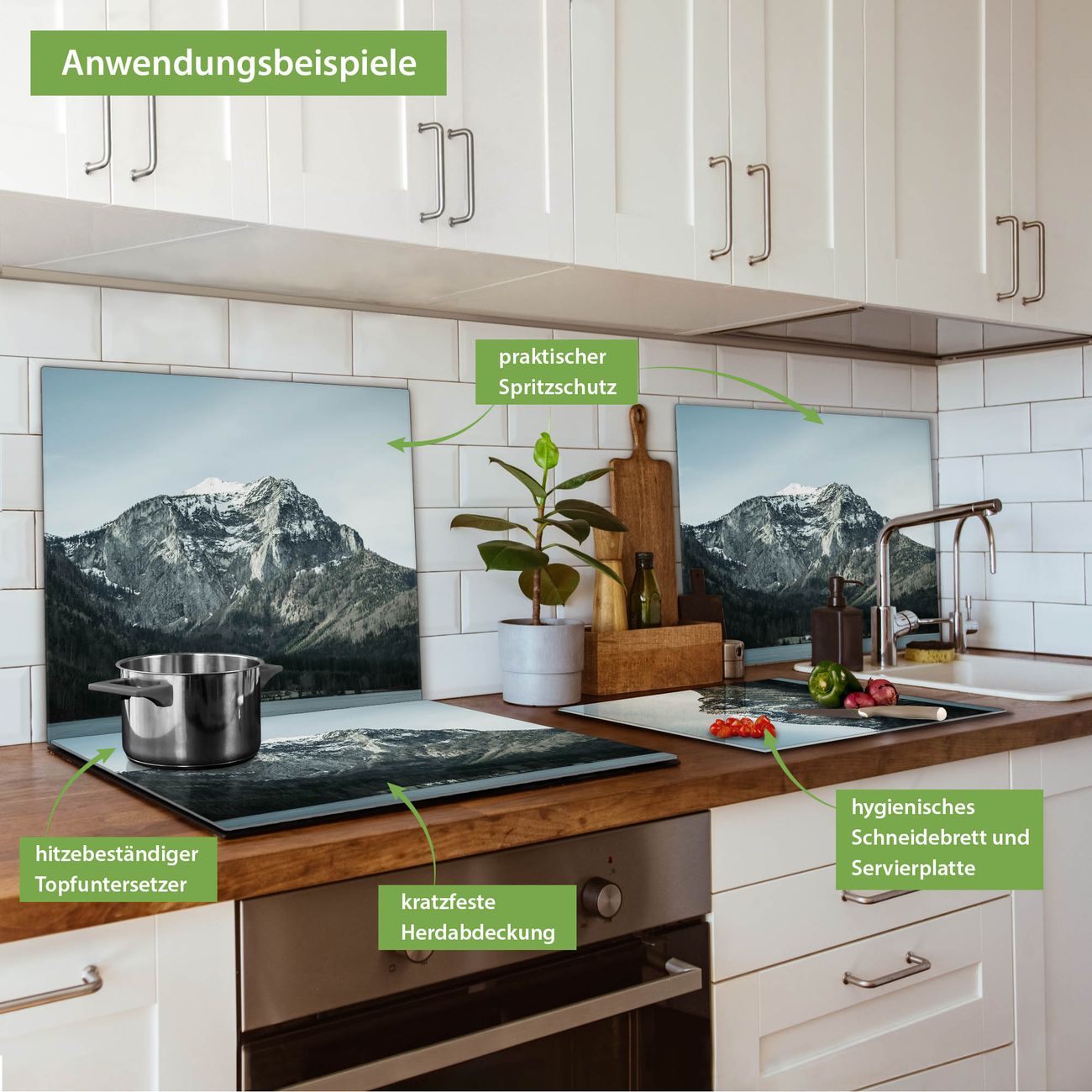 VIELSEITIG: Die Ceranfeldabdeckung ist vielseitig einsetzbar: ob als Spritzschutz hinter dem Herd für Ihre Küche oder als Glas Schneidebrett als hygienische und geruchsneutrale Unterlage. Sie können ebenfalls heiße Töpfe und Pfannen bis 100°C auf der Herdplattenabdeckung abstellen. Sie erhalten ein Multitalent für Ihre Küche. Die banjado Herdabdeckplatte aus Glas mit Motiv Im Schatten des Bergs verdeckt mit einem schönen Motiv Ihr Ceranfeld bzw. Ihren Induktionsherd. Die Herdabdeckplatte ist vielseitig einsetzbar und passt sich dabei Ihrem Einrichtungsstil an. DESIGN: Die Herdabdeckung Im Schatten des Bergs besteht aus hochwertigem, gehärtetem Glas mit einem unserer zahlreichen Motive. Sie haben die Wahl zwischen verschiedenen Maßen von einteiligen, zweiteiligen und einer dreiteiligen Herdabdeckung. Wählen Sie was zu Ihrer Einrichtung passt! DETAILS: Die Herdabdeckplatte ist vielseitig einsetzbar. Die Ecken sind für mehr Sicherheit dezent abgerundet, das Glas ist gehärtet. Sie erhalten separate Gummi Abstandshalter, damit Ihre Abdeckung rutschfest auf dem Herd steht. Diese können Sie frei positionieren, sodass die Herdabdeckung perfekt auf Ihrem Ceranfeld sitzt. BANJADO: Wir sind ein kleines Team aus dem Herzen von Sachsen und fertigen jeden Artikel nach Bestellung eigens für Sie an. Sie erhalten also keine preiswerte Importware, sondern Handarbeit. Auf Wunsch sind auch andere Farben und Größen möglich, kontakierten Sie uns gern.