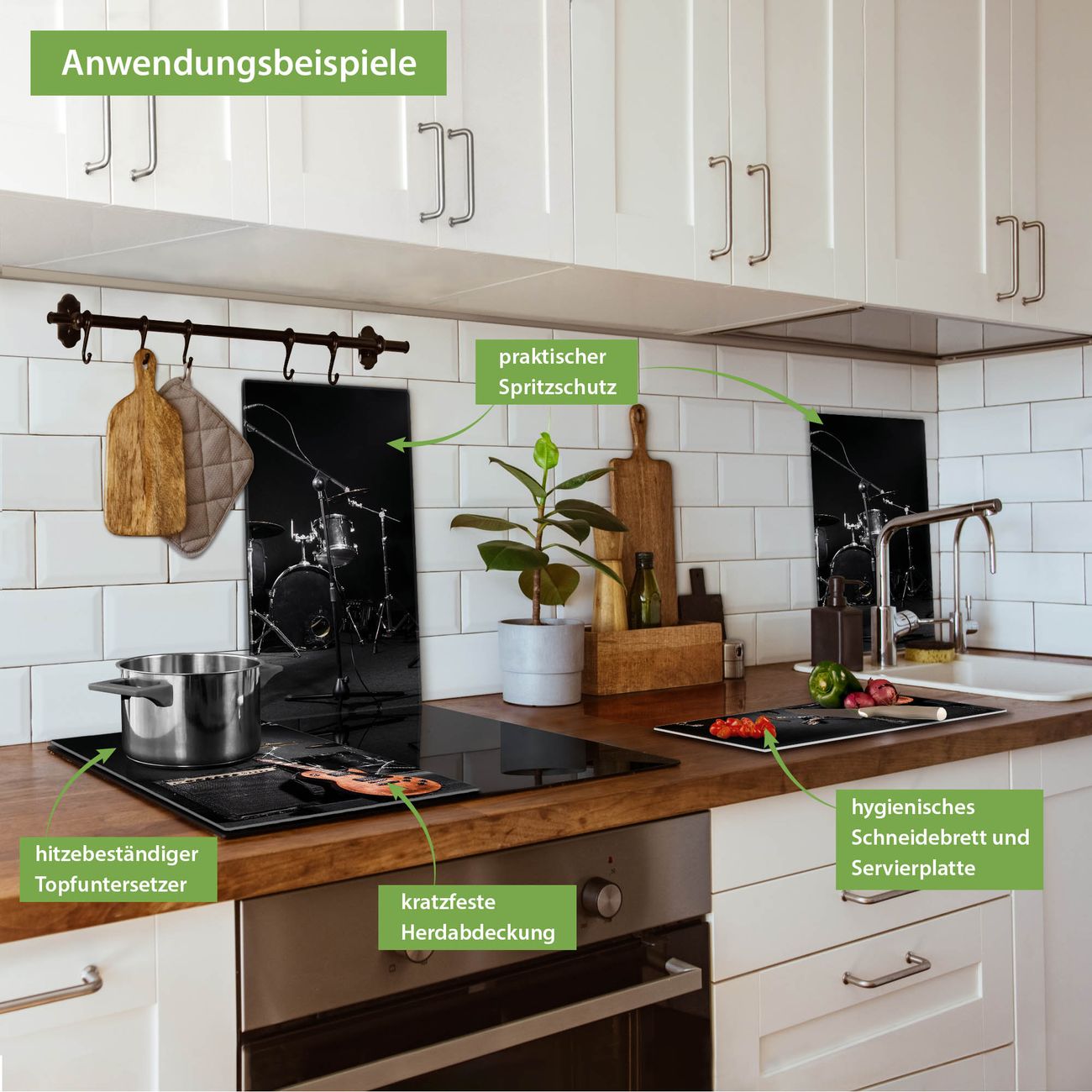 VIELSEITIG: Die Ceranfeldabdeckung ist vielseitig einsetzbar: ob als Spritzschutz hinter dem Herd für Ihre Küche oder als Glas Schneidebrett als hygienische und geruchsneutrale Unterlage. Sie können ebenfalls heiße Töpfe und Pfannen bis 100°C auf der Herdplattenabdeckung abstellen. Sie erhalten ein Multitalent für Ihre Küche. Die banjado Herdabdeckplatte aus Glas mit Motiv Jam Session verdeckt mit einem schönen Motiv Ihr Ceranfeld bzw. Ihren Induktionsherd. Die Herdabdeckplatte ist vielseitig einsetzbar und passt sich dabei Ihrem Einrichtungsstil an. DESIGN: Die Herdabdeckung Jam Session besteht aus hochwertigem, gehärtetem Glas mit einem unserer zahlreichen Motive. Sie haben die Wahl zwischen verschiedenen Maßen von einteiligen, zweiteiligen und einer dreiteiligen Herdabdeckung. Wählen Sie was zu Ihrer Einrichtung passt! DETAILS: Die Herdabdeckplatte ist vielseitig einsetzbar. Die Ecken sind für mehr Sicherheit dezent abgerundet, das Glas ist gehärtet. Sie erhalten separate Gummi Abstandshalter, damit Ihre Abdeckung rutschfest auf dem Herd steht. Diese können Sie frei positionieren, sodass die Herdabdeckung perfekt auf Ihrem Ceranfeld sitzt. BANJADO: Wir sind ein kleines Team aus dem Herzen von Sachsen und fertigen jeden Artikel nach Bestellung eigens für Sie an. Sie erhalten also keine preiswerte Importware, sondern Handarbeit. Auf Wunsch sind auch andere Farben und Größen möglich, kontakierten Sie uns gern.
