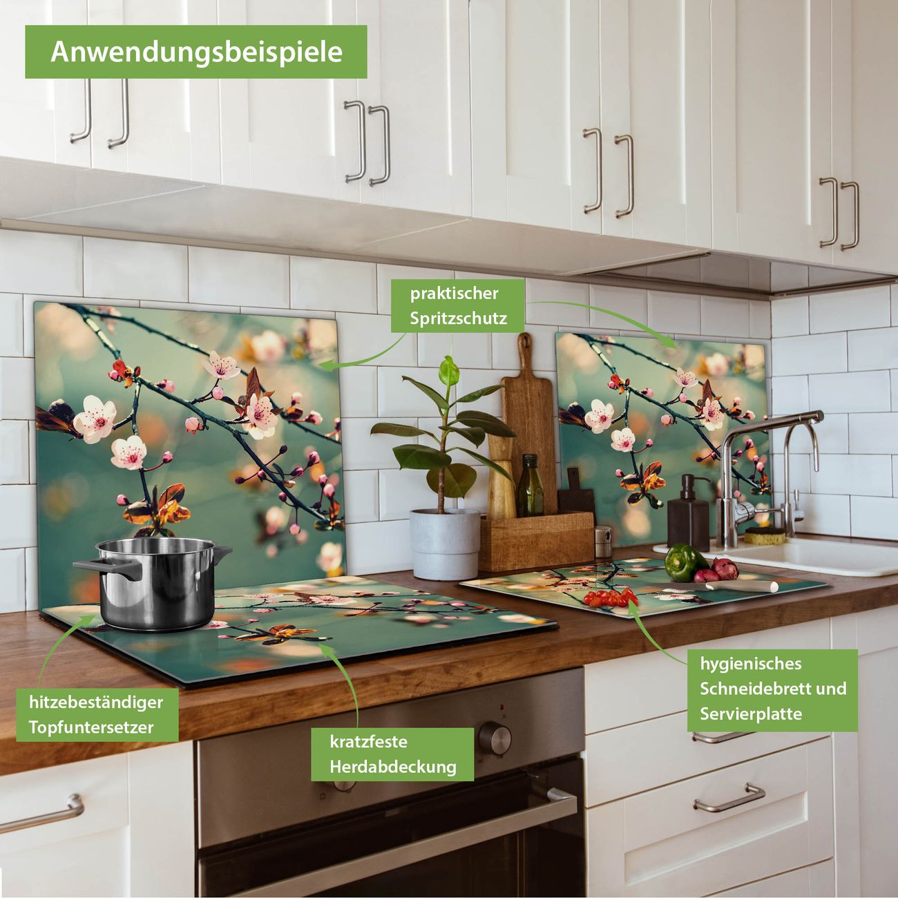 VIELSEITIG: Die Ceranfeldabdeckung ist vielseitig einsetzbar: ob als Spritzschutz hinter dem Herd für Ihre Küche oder als Glas Schneidebrett als hygienische und geruchsneutrale Unterlage. Sie können ebenfalls heiße Töpfe und Pfannen bis 100°C auf der Herdplattenabdeckung abstellen. Sie erhalten ein Multitalent für Ihre Küche. Die banjado Herdabdeckplatte aus Glas mit Motiv Japankirsche verdeckt mit einem schönen Motiv Ihr Ceranfeld bzw. Ihren Induktionsherd. Die Herdabdeckplatte ist vielseitig einsetzbar und passt sich dabei Ihrem Einrichtungsstil an. DESIGN: Die Herdabdeckung Japankirsche besteht aus hochwertigem, gehärtetem Glas mit einem unserer zahlreichen Motive. Sie haben die Wahl zwischen verschiedenen Maßen von einteiligen, zweiteiligen und einer dreiteiligen Herdabdeckung. Wählen Sie was zu Ihrer Einrichtung passt! DETAILS: Die Herdabdeckplatte ist vielseitig einsetzbar. Die Ecken sind für mehr Sicherheit dezent abgerundet, das Glas ist gehärtet. Sie erhalten separate Gummi Abstandshalter, damit Ihre Abdeckung rutschfest auf dem Herd steht. Diese können Sie frei positionieren, sodass die Herdabdeckung perfekt auf Ihrem Ceranfeld sitzt. BANJADO: Wir sind ein kleines Team aus dem Herzen von Sachsen und fertigen jeden Artikel nach Bestellung eigens für Sie an. Sie erhalten also keine preiswerte Importware, sondern Handarbeit. Auf Wunsch sind auch andere Farben und Größen möglich, kontakierten Sie uns gern.