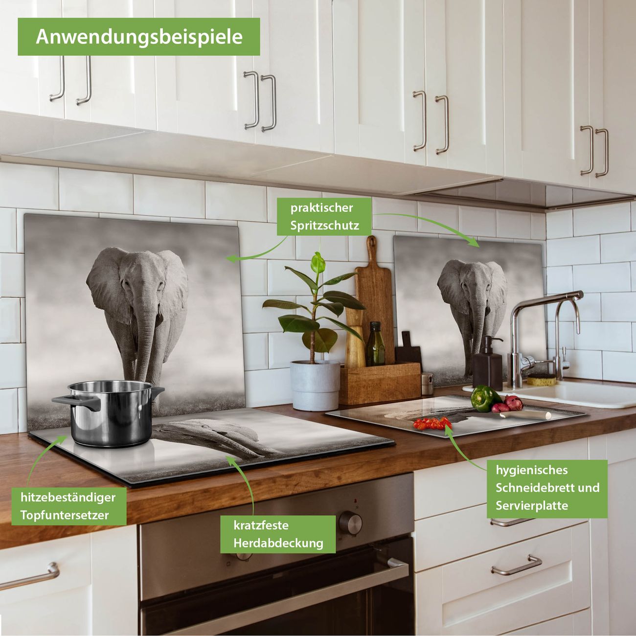 VIELSEITIG: Die Ceranfeldabdeckung ist vielseitig einsetzbar: ob als Spritzschutz hinter dem Herd für Ihre Küche oder als Glas Schneidebrett als hygienische und geruchsneutrale Unterlage. Sie können ebenfalls heiße Töpfe und Pfannen bis 100°C auf der Herdplattenabdeckung abstellen. Sie erhalten ein Multitalent für Ihre Küche. Die banjado Herdabdeckplatte aus Glas mit Motiv Joseline verdeckt mit einem schönen Motiv Ihr Ceranfeld bzw. Ihren Induktionsherd. Die Herdabdeckplatte ist vielseitig einsetzbar und passt sich dabei Ihrem Einrichtungsstil an. DESIGN: Die Herdabdeckung Joseline besteht aus hochwertigem, gehärtetem Glas mit einem unserer zahlreichen Motive. Sie haben die Wahl zwischen verschiedenen Maßen von einteiligen, zweiteiligen und einer dreiteiligen Herdabdeckung. Wählen Sie was zu Ihrer Einrichtung passt! DETAILS: Die Herdabdeckplatte ist vielseitig einsetzbar. Die Ecken sind für mehr Sicherheit dezent abgerundet, das Glas ist gehärtet. Sie erhalten separate Gummi Abstandshalter, damit Ihre Abdeckung rutschfest auf dem Herd steht. Diese können Sie frei positionieren, sodass die Herdabdeckung perfekt auf Ihrem Ceranfeld sitzt. BANJADO: Wir sind ein kleines Team aus dem Herzen von Sachsen und fertigen jeden Artikel nach Bestellung eigens für Sie an. Sie erhalten also keine preiswerte Importware, sondern Handarbeit. Auf Wunsch sind auch andere Farben und Größen möglich, kontakierten Sie uns gern.