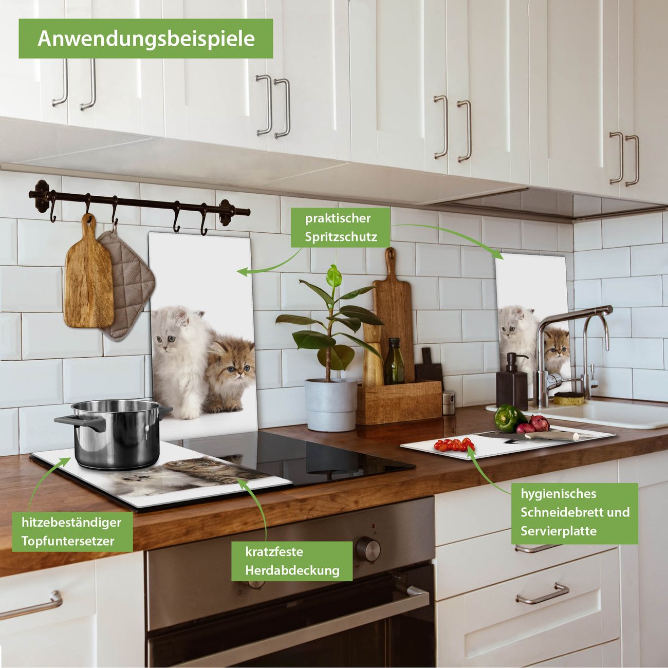 VIELSEITIG: Die Ceranfeldabdeckung ist vielseitig einsetzbar: ob als Spritzschutz hinter dem Herd für Ihre Küche oder als Glas Schneidebrett als hygienische und geruchsneutrale Unterlage. Sie können ebenfalls heiße Töpfe und Pfannen bis 100°C auf der Herdplattenabdeckung abstellen. Sie erhalten ein Multitalent für Ihre Küche. Die banjado Herdabdeckplatte aus Glas mit Motiv Kaetzchen verdeckt mit einem schönen Motiv Ihr Ceranfeld bzw. Ihren Induktionsherd. Die Herdabdeckplatte ist vielseitig einsetzbar und passt sich dabei Ihrem Einrichtungsstil an. DESIGN: Die Herdabdeckung Kaetzchen besteht aus hochwertigem, gehärtetem Glas mit einem unserer zahlreichen Motive. Sie haben die Wahl zwischen verschiedenen Maßen von einteiligen, zweiteiligen und einer dreiteiligen Herdabdeckung. Wählen Sie was zu Ihrer Einrichtung passt! DETAILS: Die Herdabdeckplatte ist vielseitig einsetzbar. Die Ecken sind für mehr Sicherheit dezent abgerundet, das Glas ist gehärtet. Sie erhalten separate Gummi Abstandshalter, damit Ihre Abdeckung rutschfest auf dem Herd steht. Diese können Sie frei positionieren, sodass die Herdabdeckung perfekt auf Ihrem Ceranfeld sitzt. BANJADO: Wir sind ein kleines Team aus dem Herzen von Sachsen und fertigen jeden Artikel nach Bestellung eigens für Sie an. Sie erhalten also keine preiswerte Importware, sondern Handarbeit. Auf Wunsch sind auch andere Farben und Größen möglich, kontakierten Sie uns gern.