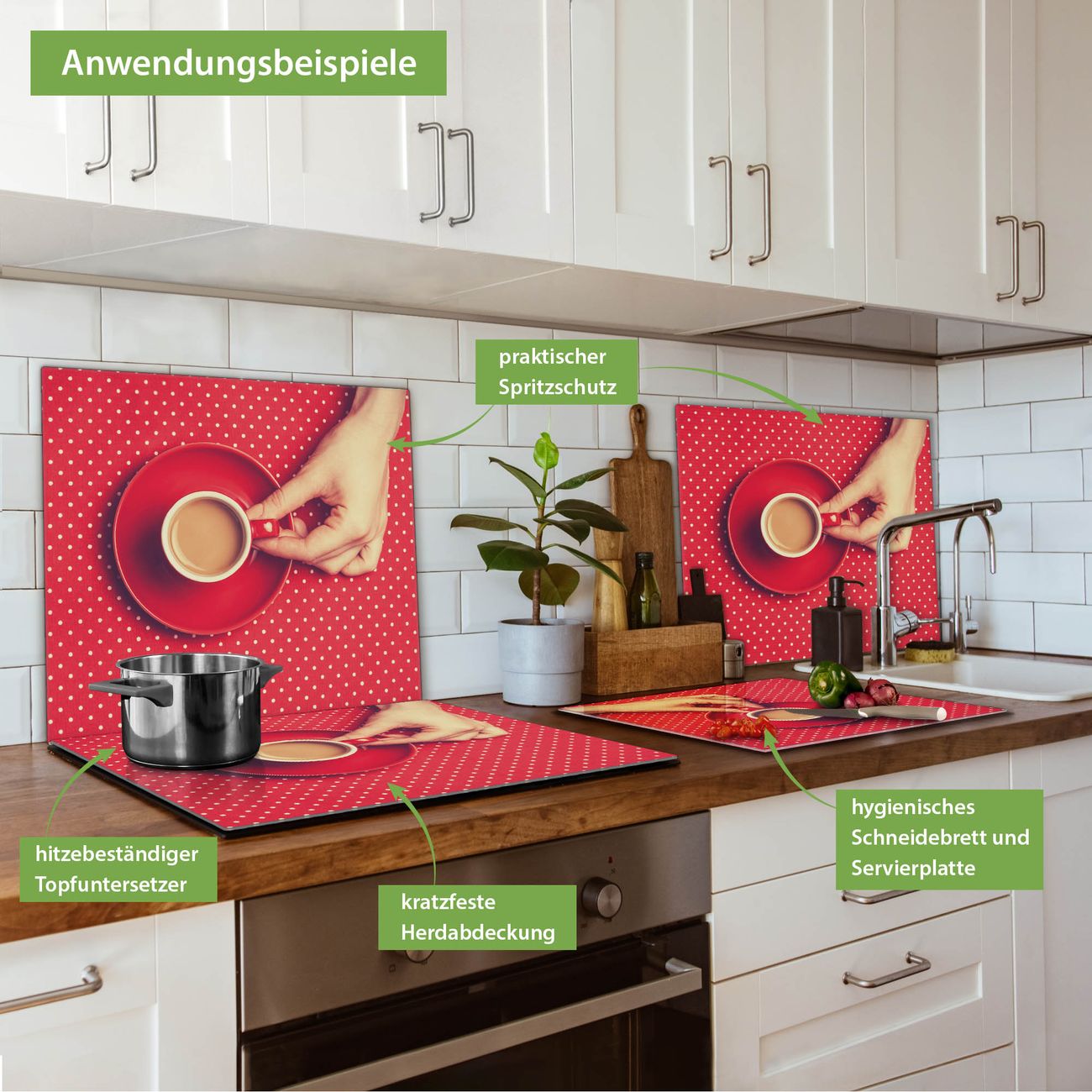 VIELSEITIG: Die Ceranfeldabdeckung ist vielseitig einsetzbar: ob als Spritzschutz hinter dem Herd für Ihre Küche oder als Glas Schneidebrett als hygienische und geruchsneutrale Unterlage. Sie können ebenfalls heiße Töpfe und Pfannen bis 100°C auf der Herdplattenabdeckung abstellen. Sie erhalten ein Multitalent für Ihre Küche. Die banjado Herdabdeckplatte aus Glas mit Motiv Kaffee Rot Weiss verdeckt mit einem schönen Motiv Ihr Ceranfeld bzw. Ihren Induktionsherd. Die Herdabdeckplatte ist vielseitig einsetzbar und passt sich dabei Ihrem Einrichtungsstil an. DESIGN: Die Herdabdeckung Kaffee Rot Weiss besteht aus hochwertigem, gehärtetem Glas mit einem unserer zahlreichen Motive. Sie haben die Wahl zwischen verschiedenen Maßen von einteiligen, zweiteiligen und einer dreiteiligen Herdabdeckung. Wählen Sie was zu Ihrer Einrichtung passt! DETAILS: Die Herdabdeckplatte ist vielseitig einsetzbar. Die Ecken sind für mehr Sicherheit dezent abgerundet, das Glas ist gehärtet. Sie erhalten separate Gummi Abstandshalter, damit Ihre Abdeckung rutschfest auf dem Herd steht. Diese können Sie frei positionieren, sodass die Herdabdeckung perfekt auf Ihrem Ceranfeld sitzt. BANJADO: Wir sind ein kleines Team aus dem Herzen von Sachsen und fertigen jeden Artikel nach Bestellung eigens für Sie an. Sie erhalten also keine preiswerte Importware, sondern Handarbeit. Auf Wunsch sind auch andere Farben und Größen möglich, kontakierten Sie uns gern.