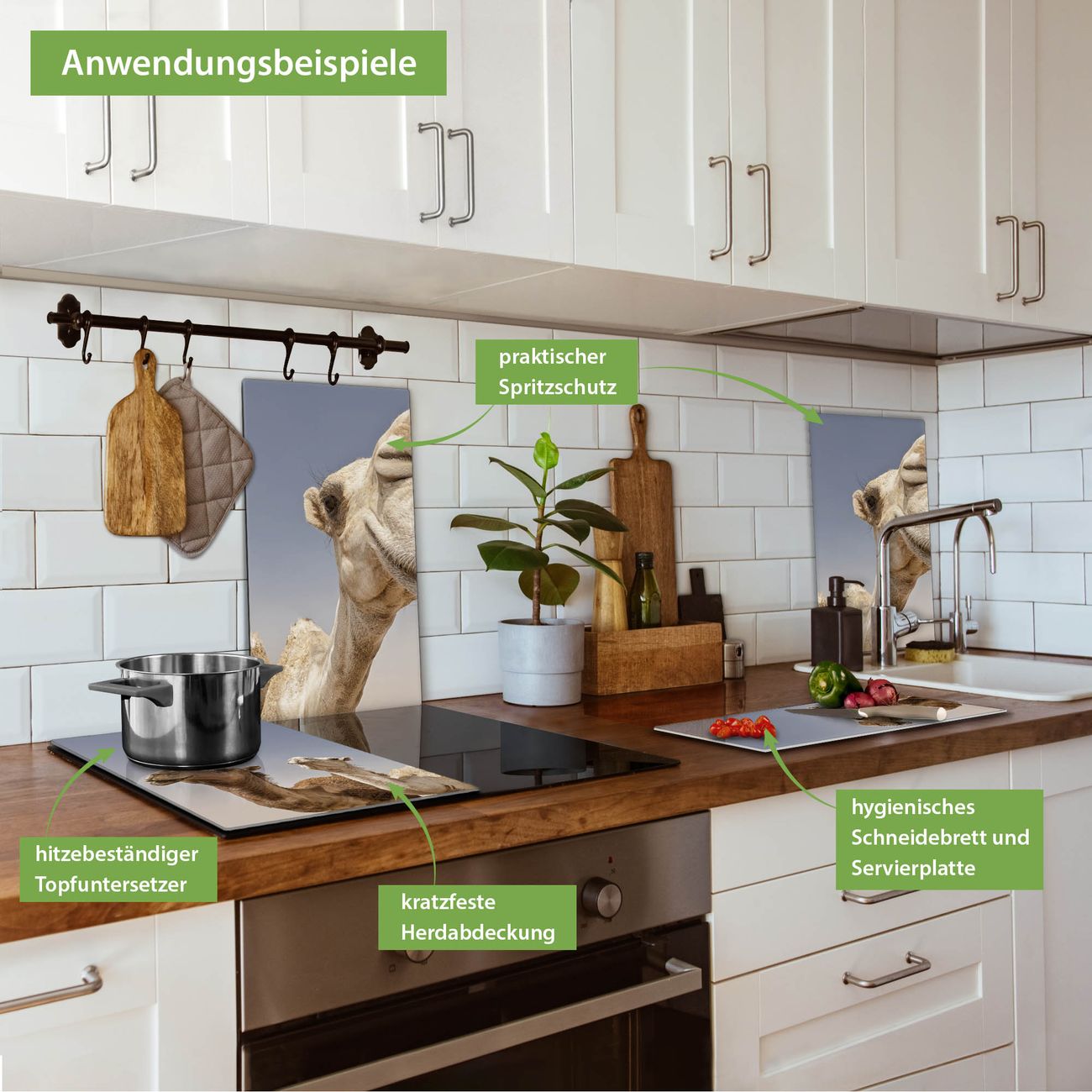 VIELSEITIG: Die Ceranfeldabdeckung ist vielseitig einsetzbar: ob als Spritzschutz hinter dem Herd für Ihre Küche oder als Glas Schneidebrett als hygienische und geruchsneutrale Unterlage. Sie können ebenfalls heiße Töpfe und Pfannen bis 100°C auf der Herdplattenabdeckung abstellen. Sie erhalten ein Multitalent für Ihre Küche. Die banjado Herdabdeckplatte aus Glas mit Motiv Kamele verdeckt mit einem schönen Motiv Ihr Ceranfeld bzw. Ihren Induktionsherd. Die Herdabdeckplatte ist vielseitig einsetzbar und passt sich dabei Ihrem Einrichtungsstil an. DESIGN: Die Herdabdeckung Kamele besteht aus hochwertigem, gehärtetem Glas mit einem unserer zahlreichen Motive. Sie haben die Wahl zwischen verschiedenen Maßen von einteiligen, zweiteiligen und einer dreiteiligen Herdabdeckung. Wählen Sie was zu Ihrer Einrichtung passt! DETAILS: Die Herdabdeckplatte ist vielseitig einsetzbar. Die Ecken sind für mehr Sicherheit dezent abgerundet, das Glas ist gehärtet. Sie erhalten separate Gummi Abstandshalter, damit Ihre Abdeckung rutschfest auf dem Herd steht. Diese können Sie frei positionieren, sodass die Herdabdeckung perfekt auf Ihrem Ceranfeld sitzt. BANJADO: Wir sind ein kleines Team aus dem Herzen von Sachsen und fertigen jeden Artikel nach Bestellung eigens für Sie an. Sie erhalten also keine preiswerte Importware, sondern Handarbeit. Auf Wunsch sind auch andere Farben und Größen möglich, kontakierten Sie uns gern.