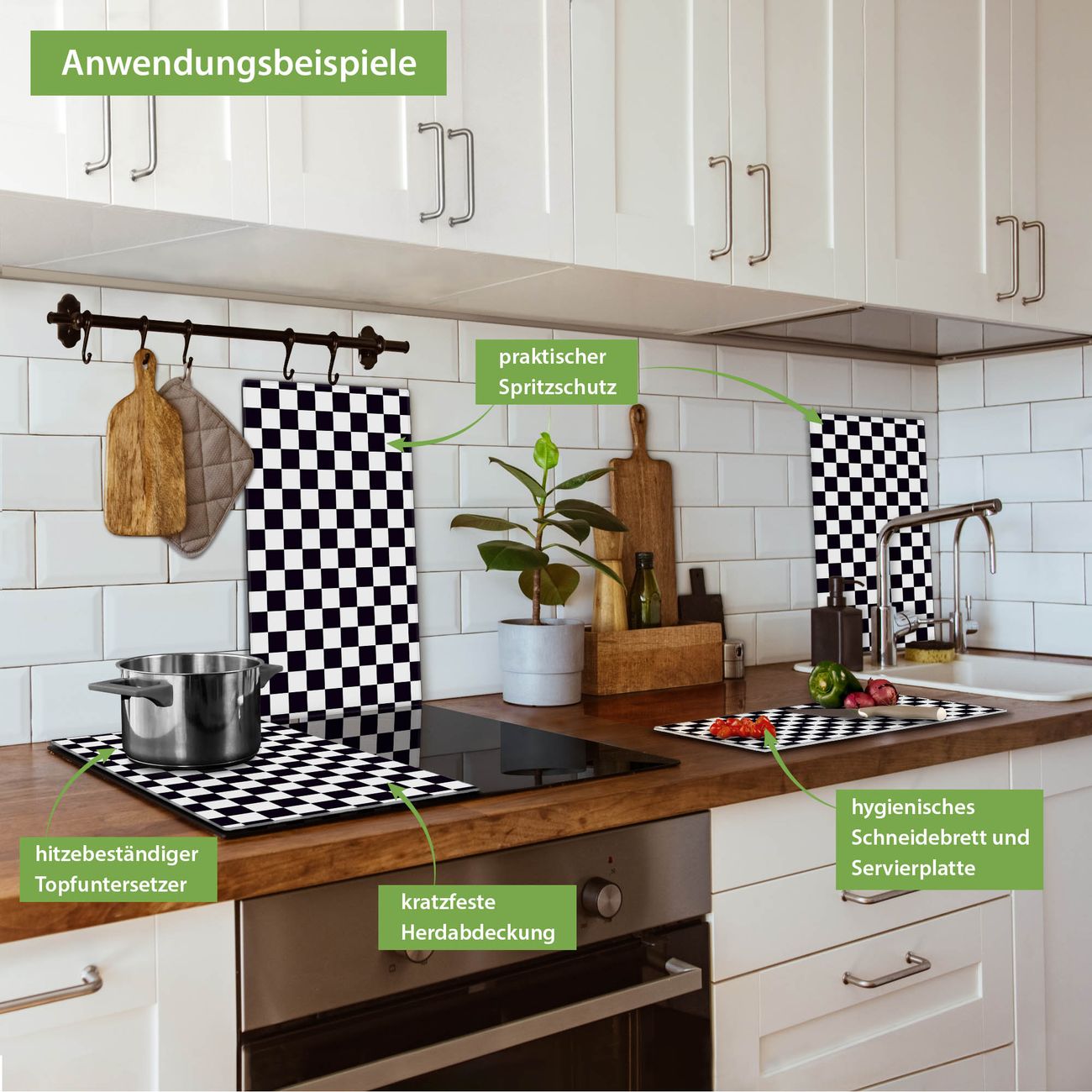 VIELSEITIG: Die Ceranfeldabdeckung ist vielseitig einsetzbar: ob als Spritzschutz hinter dem Herd für Ihre Küche oder als Glas Schneidebrett als hygienische und geruchsneutrale Unterlage. Sie können ebenfalls heiße Töpfe und Pfannen bis 100°C auf der Herdplattenabdeckung abstellen. Sie erhalten ein Multitalent für Ihre Küche. Die banjado Herdabdeckplatte aus Glas mit Motiv Karo Schwarz verdeckt mit einem schönen Motiv Ihr Ceranfeld bzw. Ihren Induktionsherd. Die Herdabdeckplatte ist vielseitig einsetzbar und passt sich dabei Ihrem Einrichtungsstil an. DESIGN: Die Herdabdeckung Karo Schwarz besteht aus hochwertigem, gehärtetem Glas mit einem unserer zahlreichen Motive. Sie haben die Wahl zwischen verschiedenen Maßen von einteiligen, zweiteiligen und einer dreiteiligen Herdabdeckung. Wählen Sie was zu Ihrer Einrichtung passt! DETAILS: Die Herdabdeckplatte ist vielseitig einsetzbar. Die Ecken sind für mehr Sicherheit dezent abgerundet, das Glas ist gehärtet. Sie erhalten separate Gummi Abstandshalter, damit Ihre Abdeckung rutschfest auf dem Herd steht. Diese können Sie frei positionieren, sodass die Herdabdeckung perfekt auf Ihrem Ceranfeld sitzt. BANJADO: Wir sind ein kleines Team aus dem Herzen von Sachsen und fertigen jeden Artikel nach Bestellung eigens für Sie an. Sie erhalten also keine preiswerte Importware, sondern Handarbeit. Auf Wunsch sind auch andere Farben und Größen möglich, kontakierten Sie uns gern.