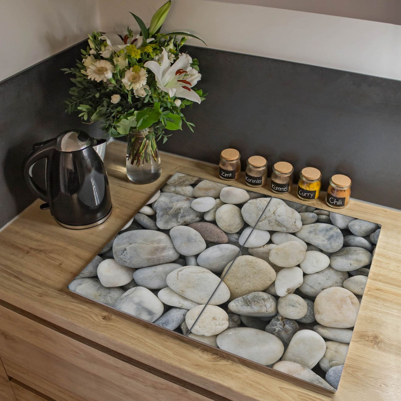 VIELSEITIG: Die Ceranfeldabdeckung ist vielseitig einsetzbar: ob als Spritzschutz hinter dem Herd für Ihre Küche oder als Glas Schneidebrett als hygienische und geruchsneutrale Unterlage. Sie können ebenfalls heiße Töpfe und Pfannen bis 100°C auf der Herdplattenabdeckung abstellen. Sie erhalten ein Multitalent für Ihre Küche. Die banjado Herdabdeckplatte aus Glas mit Motiv Kieselsteine verdeckt mit einem schönen Motiv Ihr Ceranfeld bzw. Ihren Induktionsherd. Die Herdabdeckplatte ist vielseitig einsetzbar und passt sich dabei Ihrem Einrichtungsstil an. DESIGN: Die Herdabdeckung Kieselsteine besteht aus hochwertigem, gehärtetem Glas mit einem unserer zahlreichen Motive. Sie haben die Wahl zwischen verschiedenen Maßen von einteiligen, zweiteiligen und einer dreiteiligen Herdabdeckung. Wählen Sie was zu Ihrer Einrichtung passt! DETAILS: Die Herdabdeckplatte ist vielseitig einsetzbar. Die Ecken sind für mehr Sicherheit dezent abgerundet, das Glas ist gehärtet. Sie erhalten separate Gummi Abstandshalter, damit Ihre Abdeckung rutschfest auf dem Herd steht. Diese können Sie frei positionieren, sodass die Herdabdeckung perfekt auf Ihrem Ceranfeld sitzt. BANJADO: Wir sind ein kleines Team aus dem Herzen von Sachsen und fertigen jeden Artikel nach Bestellung eigens für Sie an. Sie erhalten also keine preiswerte Importware, sondern Handarbeit. Auf Wunsch sind auch andere Farben und Größen möglich, kontakierten Sie uns gern.