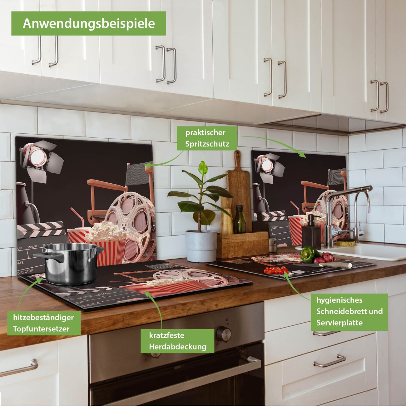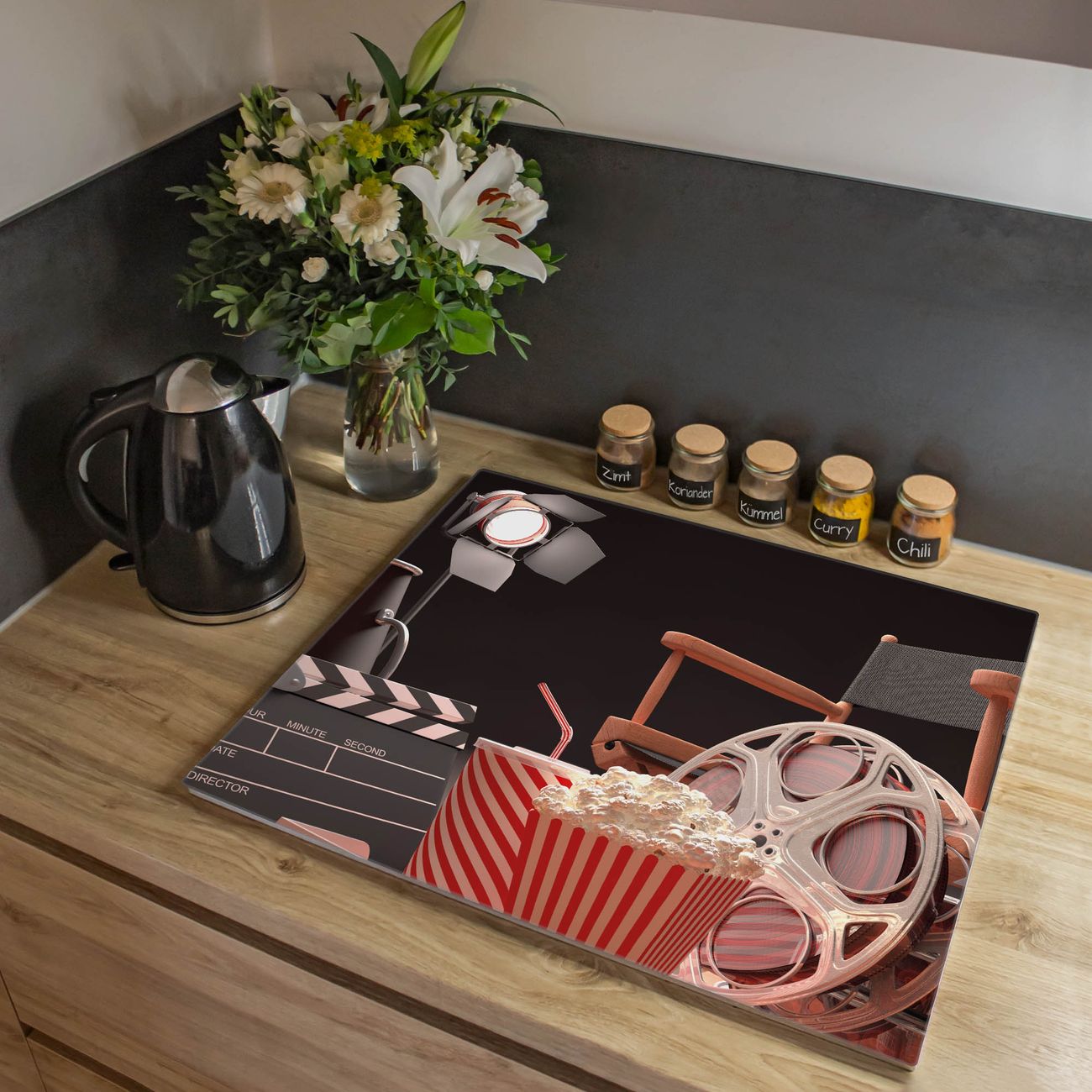 VIELSEITIG: Die Ceranfeldabdeckung ist vielseitig einsetzbar: ob als Spritzschutz hinter dem Herd für Ihre Küche oder als Glas Schneidebrett als hygienische und geruchsneutrale Unterlage. Sie können ebenfalls heiße Töpfe und Pfannen bis 100°C auf der Herdplattenabdeckung abstellen. Sie erhalten ein Multitalent für Ihre Küche. Die banjado Herdabdeckplatte aus Glas mit Motiv Kino verdeckt mit einem schönen Motiv Ihr Ceranfeld bzw. Ihren Induktionsherd. Die Herdabdeckplatte ist vielseitig einsetzbar und passt sich dabei Ihrem Einrichtungsstil an. DESIGN: Die Herdabdeckung Kino besteht aus hochwertigem, gehärtetem Glas mit einem unserer zahlreichen Motive. Sie haben die Wahl zwischen verschiedenen Maßen von einteiligen, zweiteiligen und einer dreiteiligen Herdabdeckung. Wählen Sie was zu Ihrer Einrichtung passt! DETAILS: Die Herdabdeckplatte ist vielseitig einsetzbar. Die Ecken sind für mehr Sicherheit dezent abgerundet, das Glas ist gehärtet. Sie erhalten separate Gummi Abstandshalter, damit Ihre Abdeckung rutschfest auf dem Herd steht. Diese können Sie frei positionieren, sodass die Herdabdeckung perfekt auf Ihrem Ceranfeld sitzt. BANJADO: Wir sind ein kleines Team aus dem Herzen von Sachsen und fertigen jeden Artikel nach Bestellung eigens für Sie an. Sie erhalten also keine preiswerte Importware, sondern Handarbeit. Auf Wunsch sind auch andere Farben und Größen möglich, kontakierten Sie uns gern.