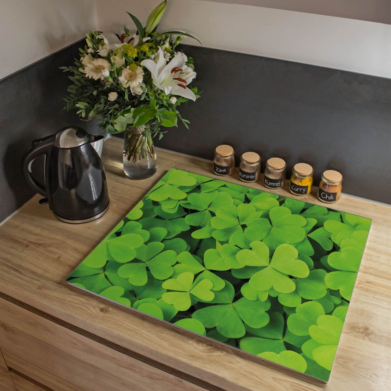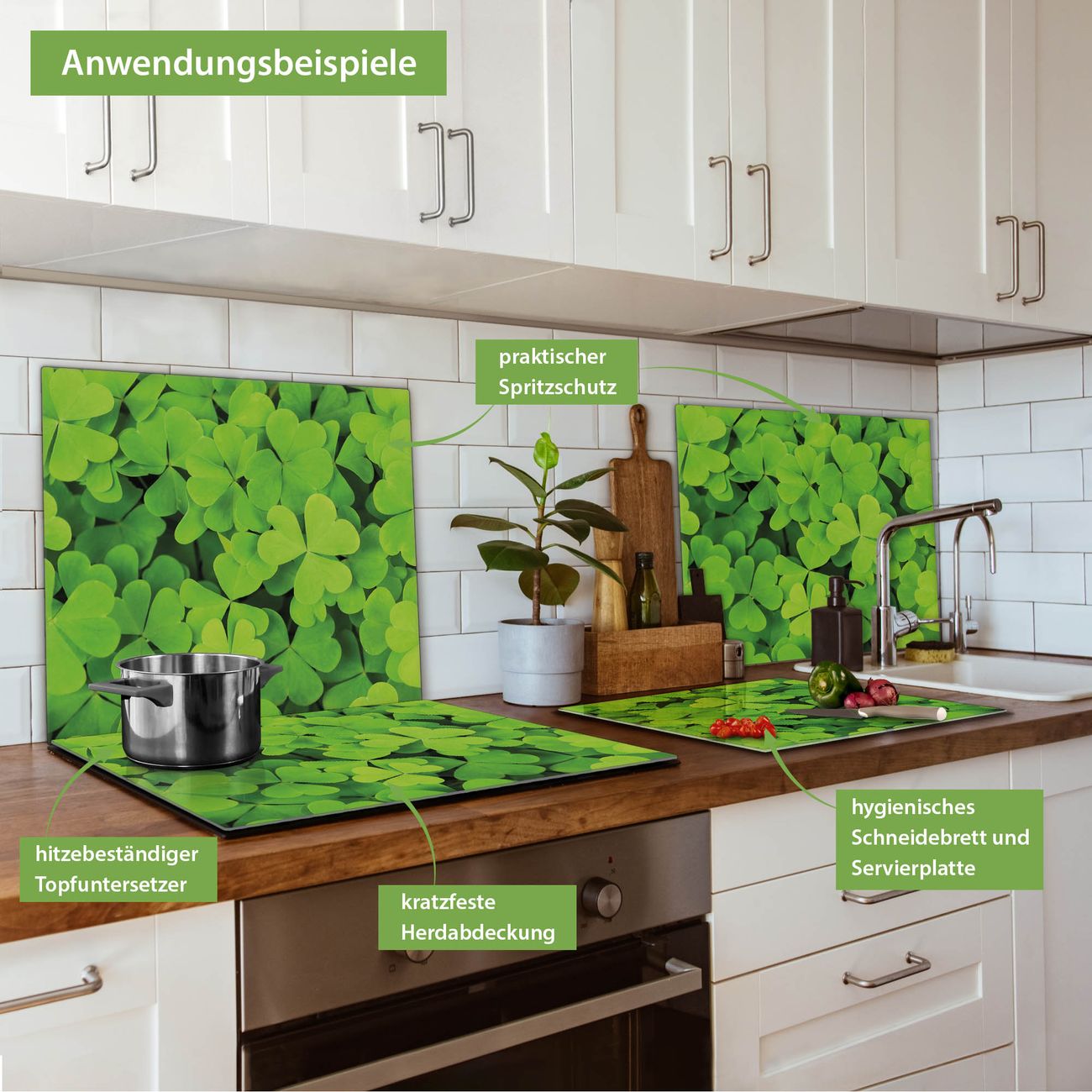 VIELSEITIG: Die Ceranfeldabdeckung ist vielseitig einsetzbar: ob als Spritzschutz hinter dem Herd für Ihre Küche oder als Glas Schneidebrett als hygienische und geruchsneutrale Unterlage. Sie können ebenfalls heiße Töpfe und Pfannen bis 100°C auf der Herdplattenabdeckung abstellen. Sie erhalten ein Multitalent für Ihre Küche. Die banjado Herdabdeckplatte aus Glas mit Motiv Klee verdeckt mit einem schönen Motiv Ihr Ceranfeld bzw. Ihren Induktionsherd. Die Herdabdeckplatte ist vielseitig einsetzbar und passt sich dabei Ihrem Einrichtungsstil an. DESIGN: Die Herdabdeckung Klee besteht aus hochwertigem, gehärtetem Glas mit einem unserer zahlreichen Motive. Sie haben die Wahl zwischen verschiedenen Maßen von einteiligen, zweiteiligen und einer dreiteiligen Herdabdeckung. Wählen Sie was zu Ihrer Einrichtung passt! DETAILS: Die Herdabdeckplatte ist vielseitig einsetzbar. Die Ecken sind für mehr Sicherheit dezent abgerundet, das Glas ist gehärtet. Sie erhalten separate Gummi Abstandshalter, damit Ihre Abdeckung rutschfest auf dem Herd steht. Diese können Sie frei positionieren, sodass die Herdabdeckung perfekt auf Ihrem Ceranfeld sitzt. BANJADO: Wir sind ein kleines Team aus dem Herzen von Sachsen und fertigen jeden Artikel nach Bestellung eigens für Sie an. Sie erhalten also keine preiswerte Importware, sondern Handarbeit. Auf Wunsch sind auch andere Farben und Größen möglich, kontakierten Sie uns gern.