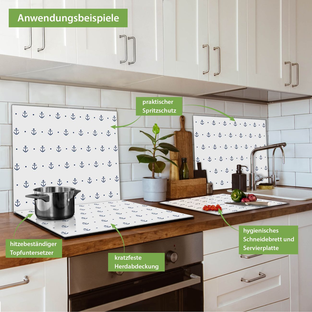 VIELSEITIG: Die Ceranfeldabdeckung ist vielseitig einsetzbar: ob als Spritzschutz hinter dem Herd für Ihre Küche oder als Glas Schneidebrett als hygienische und geruchsneutrale Unterlage. Sie können ebenfalls heiße Töpfe und Pfannen bis 100°C auf der Herdplattenabdeckung abstellen. Sie erhalten ein Multitalent für Ihre Küche. Die banjado Herdabdeckplatte aus Glas mit Motiv Kleine Anker verdeckt mit einem schönen Motiv Ihr Ceranfeld bzw. Ihren Induktionsherd. Die Herdabdeckplatte ist vielseitig einsetzbar und passt sich dabei Ihrem Einrichtungsstil an. DESIGN: Die Herdabdeckung Kleine Anker besteht aus hochwertigem, gehärtetem Glas mit einem unserer zahlreichen Motive. Sie haben die Wahl zwischen verschiedenen Maßen von einteiligen, zweiteiligen und einer dreiteiligen Herdabdeckung. Wählen Sie was zu Ihrer Einrichtung passt! DETAILS: Die Herdabdeckplatte ist vielseitig einsetzbar. Die Ecken sind für mehr Sicherheit dezent abgerundet, das Glas ist gehärtet. Sie erhalten separate Gummi Abstandshalter, damit Ihre Abdeckung rutschfest auf dem Herd steht. Diese können Sie frei positionieren, sodass die Herdabdeckung perfekt auf Ihrem Ceranfeld sitzt. BANJADO: Wir sind ein kleines Team aus dem Herzen von Sachsen und fertigen jeden Artikel nach Bestellung eigens für Sie an. Sie erhalten also keine preiswerte Importware, sondern Handarbeit. Auf Wunsch sind auch andere Farben und Größen möglich, kontakierten Sie uns gern.