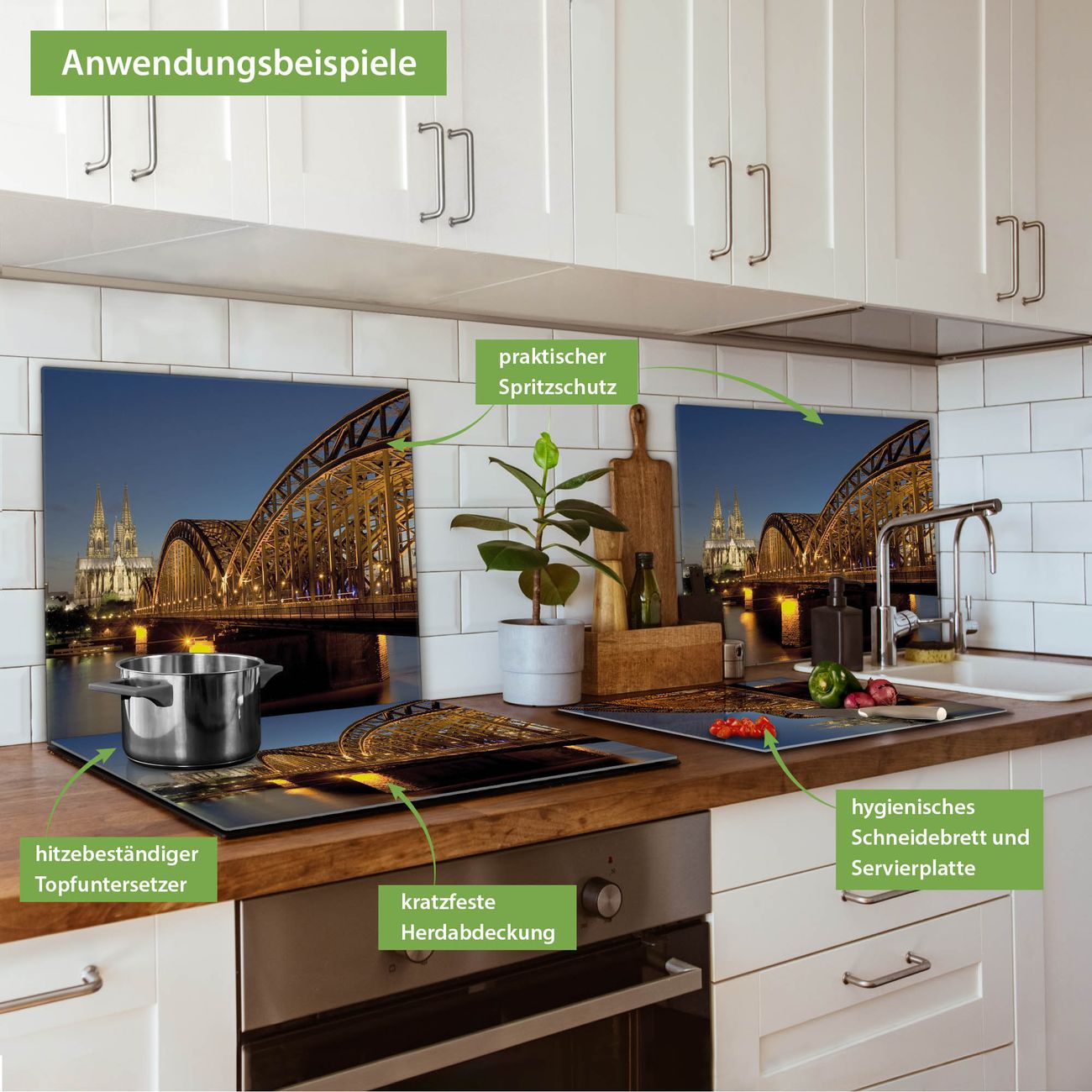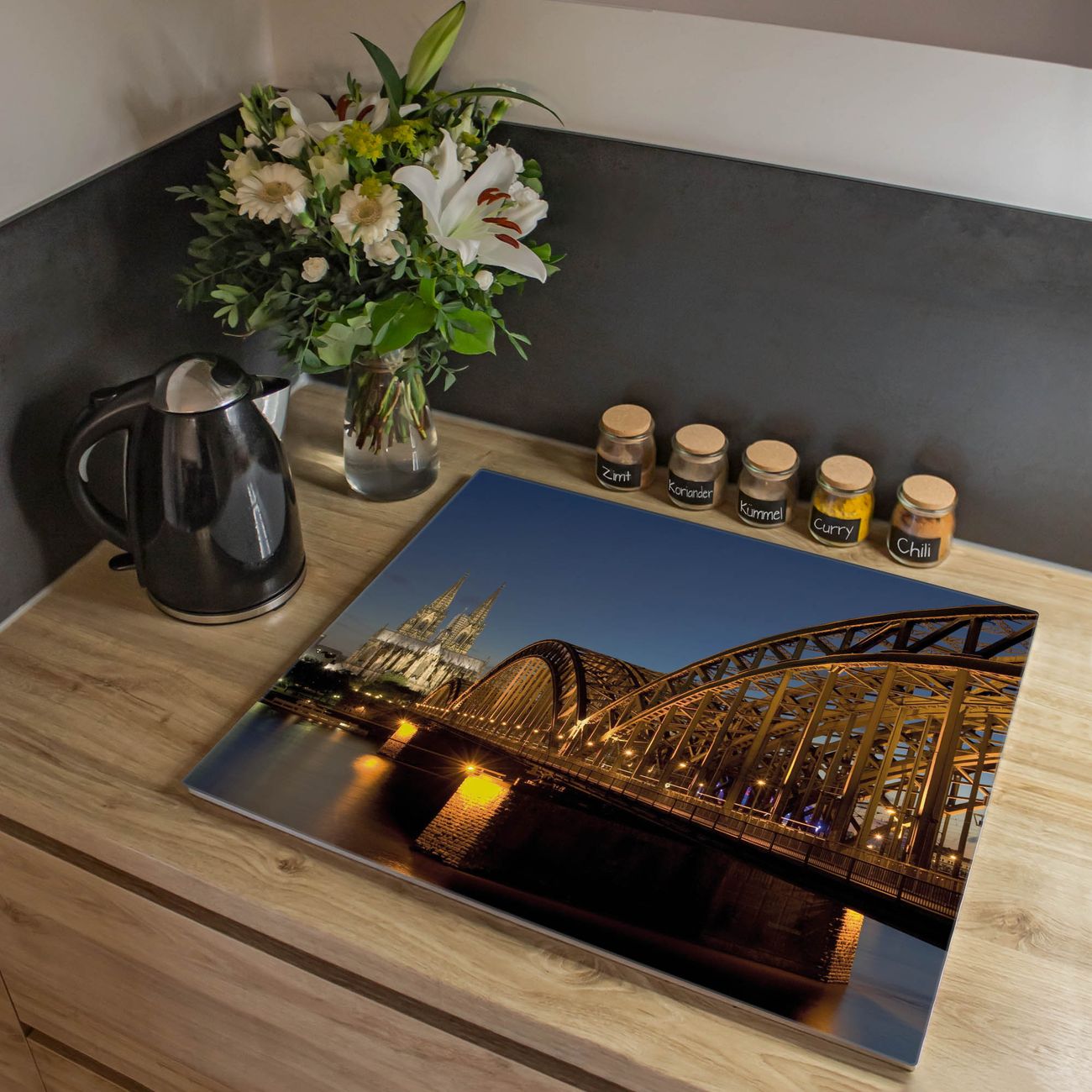 VIELSEITIG: Die Ceranfeldabdeckung ist vielseitig einsetzbar: ob als Spritzschutz hinter dem Herd für Ihre Küche oder als Glas Schneidebrett als hygienische und geruchsneutrale Unterlage. Sie können ebenfalls heiße Töpfe und Pfannen bis 100°C auf der Herdplattenabdeckung abstellen. Sie erhalten ein Multitalent für Ihre Küche. Die banjado Herdabdeckplatte aus Glas mit Motiv Köln verdeckt mit einem schönen Motiv Ihr Ceranfeld bzw. Ihren Induktionsherd. Die Herdabdeckplatte ist vielseitig einsetzbar und passt sich dabei Ihrem Einrichtungsstil an. DESIGN: Die Herdabdeckung Köln besteht aus hochwertigem, gehärtetem Glas mit einem unserer zahlreichen Motive. Sie haben die Wahl zwischen verschiedenen Maßen von einteiligen, zweiteiligen und einer dreiteiligen Herdabdeckung. Wählen Sie was zu Ihrer Einrichtung passt! DETAILS: Die Herdabdeckplatte ist vielseitig einsetzbar. Die Ecken sind für mehr Sicherheit dezent abgerundet, das Glas ist gehärtet. Sie erhalten separate Gummi Abstandshalter, damit Ihre Abdeckung rutschfest auf dem Herd steht. Diese können Sie frei positionieren, sodass die Herdabdeckung perfekt auf Ihrem Ceranfeld sitzt. BANJADO: Wir sind ein kleines Team aus dem Herzen von Sachsen und fertigen jeden Artikel nach Bestellung eigens für Sie an. Sie erhalten also keine preiswerte Importware, sondern Handarbeit. Auf Wunsch sind auch andere Farben und Größen möglich, kontakierten Sie uns gern.