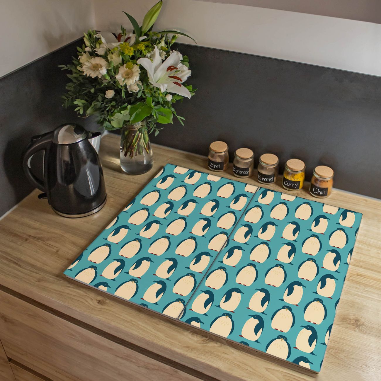 VIELSEITIG: Die Ceranfeldabdeckung ist vielseitig einsetzbar: ob als Spritzschutz hinter dem Herd für Ihre Küche oder als Glas Schneidebrett als hygienische und geruchsneutrale Unterlage. Sie können ebenfalls heiße Töpfe und Pfannen bis 100°C auf der Herdplattenabdeckung abstellen. Sie erhalten ein Multitalent für Ihre Küche. Die banjado Herdabdeckplatte aus Glas mit Motiv Königspinguine verdeckt mit einem schönen Motiv Ihr Ceranfeld bzw. Ihren Induktionsherd. Die Herdabdeckplatte ist vielseitig einsetzbar und passt sich dabei Ihrem Einrichtungsstil an. DESIGN: Die Herdabdeckung Königspinguine besteht aus hochwertigem, gehärtetem Glas mit einem unserer zahlreichen Motive. Sie haben die Wahl zwischen verschiedenen Maßen von einteiligen, zweiteiligen und einer dreiteiligen Herdabdeckung. Wählen Sie was zu Ihrer Einrichtung passt! DETAILS: Die Herdabdeckplatte ist vielseitig einsetzbar. Die Ecken sind für mehr Sicherheit dezent abgerundet, das Glas ist gehärtet. Sie erhalten separate Gummi Abstandshalter, damit Ihre Abdeckung rutschfest auf dem Herd steht. Diese können Sie frei positionieren, sodass die Herdabdeckung perfekt auf Ihrem Ceranfeld sitzt. BANJADO: Wir sind ein kleines Team aus dem Herzen von Sachsen und fertigen jeden Artikel nach Bestellung eigens für Sie an. Sie erhalten also keine preiswerte Importware, sondern Handarbeit. Auf Wunsch sind auch andere Farben und Größen möglich, kontakierten Sie uns gern.