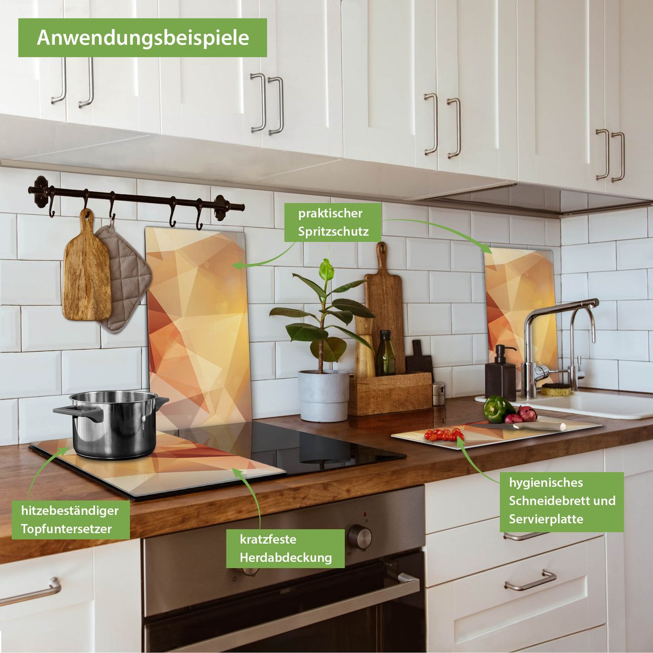 VIELSEITIG: Die Ceranfeldabdeckung ist vielseitig einsetzbar: ob als Spritzschutz hinter dem Herd für Ihre Küche oder als Glas Schneidebrett als hygienische und geruchsneutrale Unterlage. Sie können ebenfalls heiße Töpfe und Pfannen bis 100°C auf der Herdplattenabdeckung abstellen. Sie erhalten ein Multitalent für Ihre Küche. Die banjado Herdabdeckplatte aus Glas mit Motiv Kristall verdeckt mit einem schönen Motiv Ihr Ceranfeld bzw. Ihren Induktionsherd. Die Herdabdeckplatte ist vielseitig einsetzbar und passt sich dabei Ihrem Einrichtungsstil an. DESIGN: Die Herdabdeckung Kristall besteht aus hochwertigem, gehärtetem Glas mit einem unserer zahlreichen Motive. Sie haben die Wahl zwischen verschiedenen Maßen von einteiligen, zweiteiligen und einer dreiteiligen Herdabdeckung. Wählen Sie was zu Ihrer Einrichtung passt! DETAILS: Die Herdabdeckplatte ist vielseitig einsetzbar. Die Ecken sind für mehr Sicherheit dezent abgerundet, das Glas ist gehärtet. Sie erhalten separate Gummi Abstandshalter, damit Ihre Abdeckung rutschfest auf dem Herd steht. Diese können Sie frei positionieren, sodass die Herdabdeckung perfekt auf Ihrem Ceranfeld sitzt. BANJADO: Wir sind ein kleines Team aus dem Herzen von Sachsen und fertigen jeden Artikel nach Bestellung eigens für Sie an. Sie erhalten also keine preiswerte Importware, sondern Handarbeit. Auf Wunsch sind auch andere Farben und Größen möglich, kontakierten Sie uns gern.