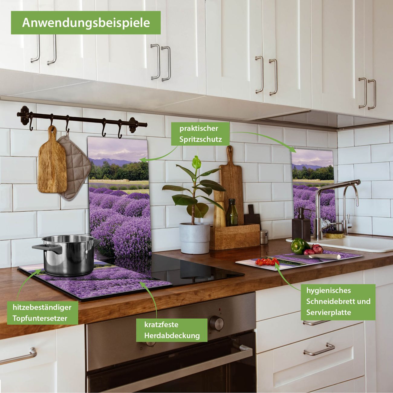 VIELSEITIG: Die Ceranfeldabdeckung ist vielseitig einsetzbar: ob als Spritzschutz hinter dem Herd für Ihre Küche oder als Glas Schneidebrett als hygienische und geruchsneutrale Unterlage. Sie können ebenfalls heiße Töpfe und Pfannen bis 100°C auf der Herdplattenabdeckung abstellen. Sie erhalten ein Multitalent für Ihre Küche. Die banjado Herdabdeckplatte aus Glas mit Motiv Lavendel 1 verdeckt mit einem schönen Motiv Ihr Ceranfeld bzw. Ihren Induktionsherd. Die Herdabdeckplatte ist vielseitig einsetzbar und passt sich dabei Ihrem Einrichtungsstil an. DESIGN: Die Herdabdeckung Lavendel 1 besteht aus hochwertigem, gehärtetem Glas mit einem unserer zahlreichen Motive. Sie haben die Wahl zwischen verschiedenen Maßen von einteiligen, zweiteiligen und einer dreiteiligen Herdabdeckung. Wählen Sie was zu Ihrer Einrichtung passt! DETAILS: Die Herdabdeckplatte ist vielseitig einsetzbar. Die Ecken sind für mehr Sicherheit dezent abgerundet, das Glas ist gehärtet. Sie erhalten separate Gummi Abstandshalter, damit Ihre Abdeckung rutschfest auf dem Herd steht. Diese können Sie frei positionieren, sodass die Herdabdeckung perfekt auf Ihrem Ceranfeld sitzt. BANJADO: Wir sind ein kleines Team aus dem Herzen von Sachsen und fertigen jeden Artikel nach Bestellung eigens für Sie an. Sie erhalten also keine preiswerte Importware, sondern Handarbeit. Auf Wunsch sind auch andere Farben und Größen möglich, kontakierten Sie uns gern.