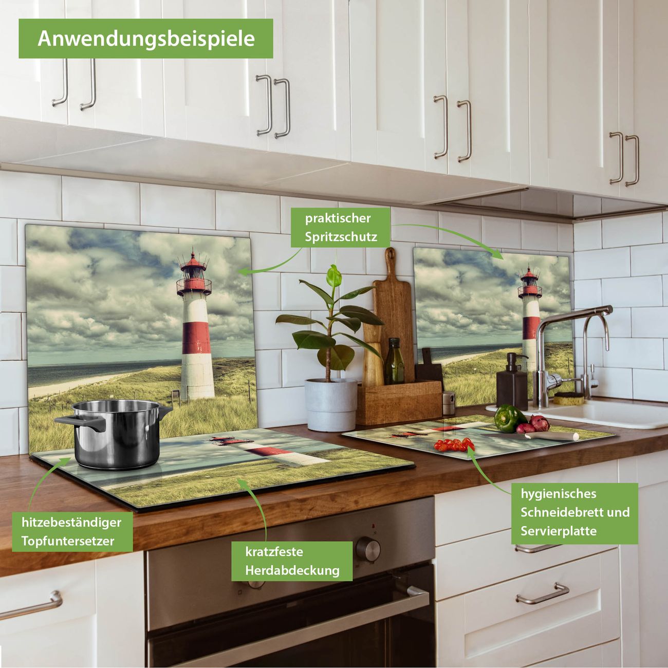 VIELSEITIG: Die Ceranfeldabdeckung ist vielseitig einsetzbar: ob als Spritzschutz hinter dem Herd für Ihre Küche oder als Glas Schneidebrett als hygienische und geruchsneutrale Unterlage. Sie können ebenfalls heiße Töpfe und Pfannen bis 100°C auf der Herdplattenabdeckung abstellen. Sie erhalten ein Multitalent für Ihre Küche. Die banjado Herdabdeckplatte aus Glas mit Motiv Leuchtturm Sylt verdeckt mit einem schönen Motiv Ihr Ceranfeld bzw. Ihren Induktionsherd. Die Herdabdeckplatte ist vielseitig einsetzbar und passt sich dabei Ihrem Einrichtungsstil an. DESIGN: Die Herdabdeckung Leuchtturm Sylt besteht aus hochwertigem, gehärtetem Glas mit einem unserer zahlreichen Motive. Sie haben die Wahl zwischen verschiedenen Maßen von einteiligen, zweiteiligen und einer dreiteiligen Herdabdeckung. Wählen Sie was zu Ihrer Einrichtung passt! DETAILS: Die Herdabdeckplatte ist vielseitig einsetzbar. Die Ecken sind für mehr Sicherheit dezent abgerundet, das Glas ist gehärtet. Sie erhalten separate Gummi Abstandshalter, damit Ihre Abdeckung rutschfest auf dem Herd steht. Diese können Sie frei positionieren, sodass die Herdabdeckung perfekt auf Ihrem Ceranfeld sitzt. BANJADO: Wir sind ein kleines Team aus dem Herzen von Sachsen und fertigen jeden Artikel nach Bestellung eigens für Sie an. Sie erhalten also keine preiswerte Importware, sondern Handarbeit. Auf Wunsch sind auch andere Farben und Größen möglich, kontakierten Sie uns gern.