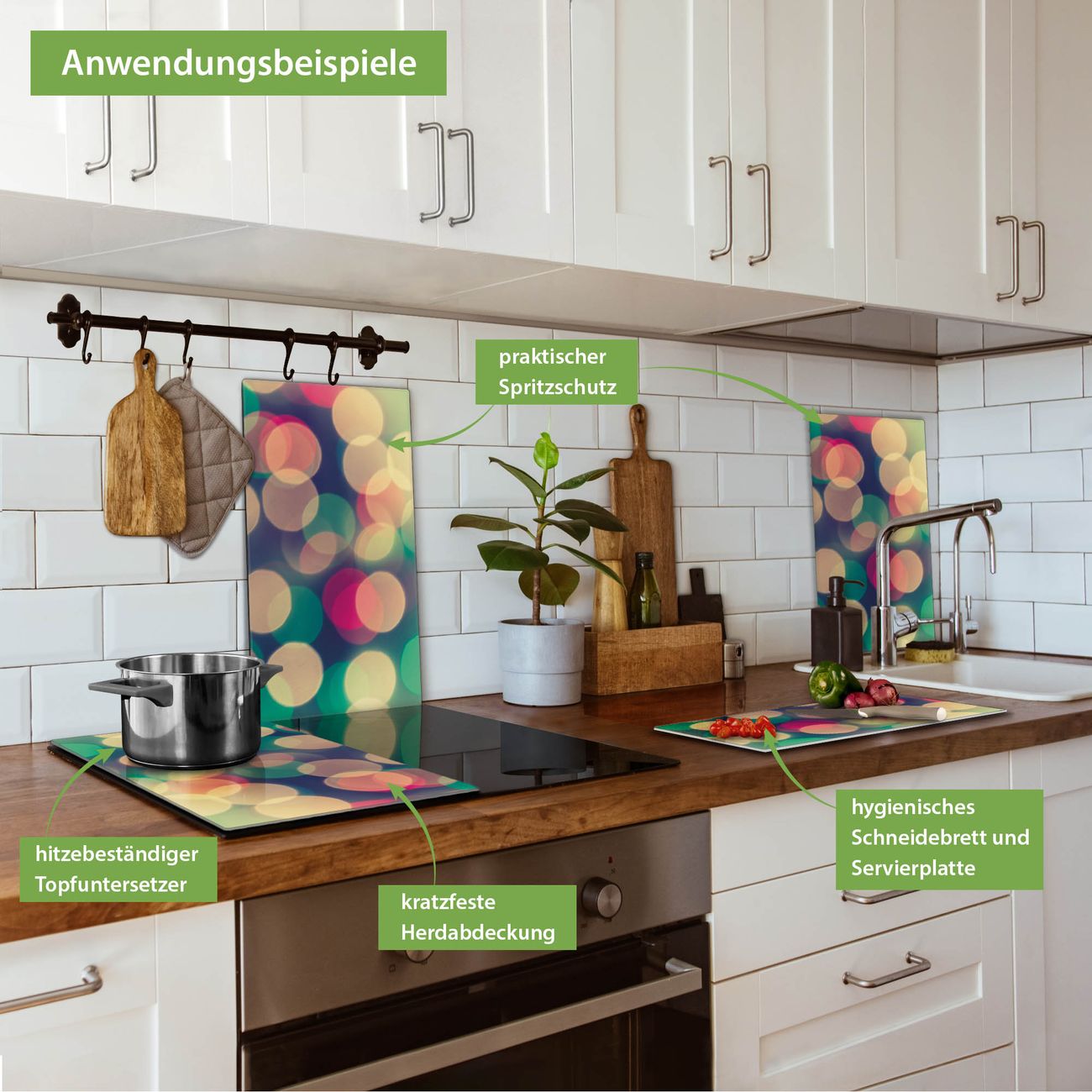 VIELSEITIG: Die Ceranfeldabdeckung ist vielseitig einsetzbar: ob als Spritzschutz hinter dem Herd für Ihre Küche oder als Glas Schneidebrett als hygienische und geruchsneutrale Unterlage. Sie können ebenfalls heiße Töpfe und Pfannen bis 100°C auf der Herdplattenabdeckung abstellen. Sie erhalten ein Multitalent für Ihre Küche. Die banjado Herdabdeckplatte aus Glas mit Motiv Lichtpunkte Weiß Grün Rot verdeckt mit einem schönen Motiv Ihr Ceranfeld bzw. Ihren Induktionsherd. Die Herdabdeckplatte ist vielseitig einsetzbar und passt sich dabei Ihrem Einrichtungsstil an. DESIGN: Die Herdabdeckung Lichtpunkte Weiß Grün Rot besteht aus hochwertigem, gehärtetem Glas mit einem unserer zahlreichen Motive. Sie haben die Wahl zwischen verschiedenen Maßen von einteiligen, zweiteiligen und einer dreiteiligen Herdabdeckung. Wählen Sie was zu Ihrer Einrichtung passt! DETAILS: Die Herdabdeckplatte ist vielseitig einsetzbar. Die Ecken sind für mehr Sicherheit dezent abgerundet, das Glas ist gehärtet. Sie erhalten separate Gummi Abstandshalter, damit Ihre Abdeckung rutschfest auf dem Herd steht. Diese können Sie frei positionieren, sodass die Herdabdeckung perfekt auf Ihrem Ceranfeld sitzt. BANJADO: Wir sind ein kleines Team aus dem Herzen von Sachsen und fertigen jeden Artikel nach Bestellung eigens für Sie an. Sie erhalten also keine preiswerte Importware, sondern Handarbeit. Auf Wunsch sind auch andere Farben und Größen möglich, kontakierten Sie uns gern.