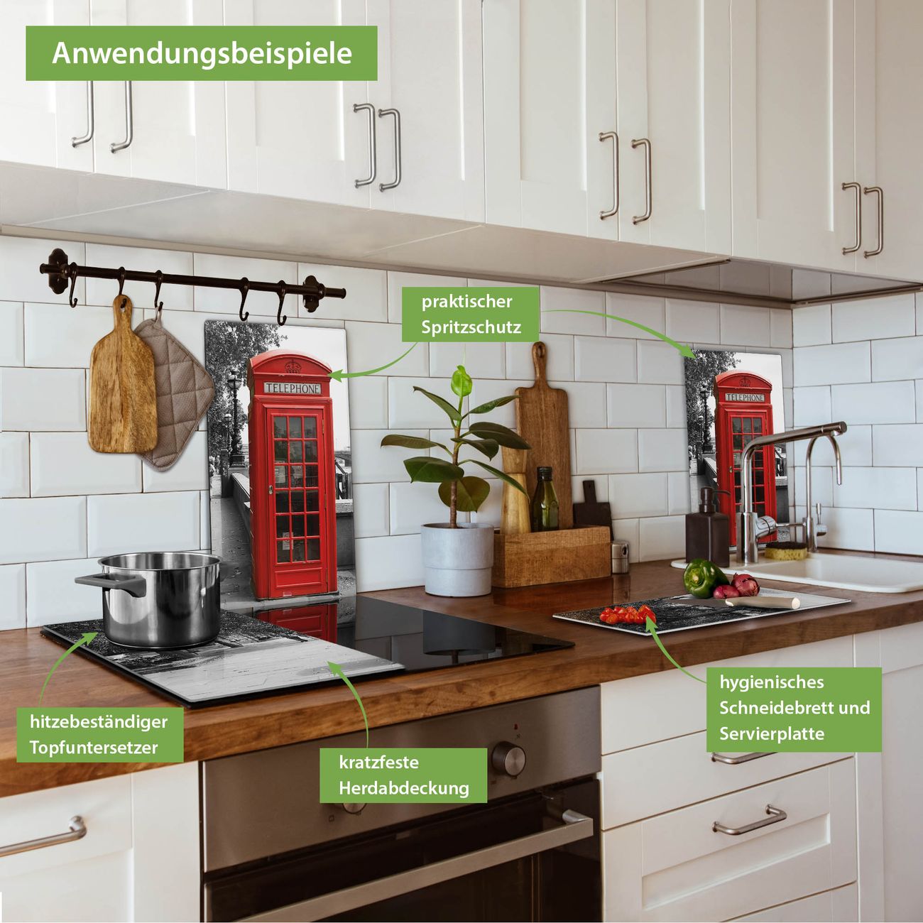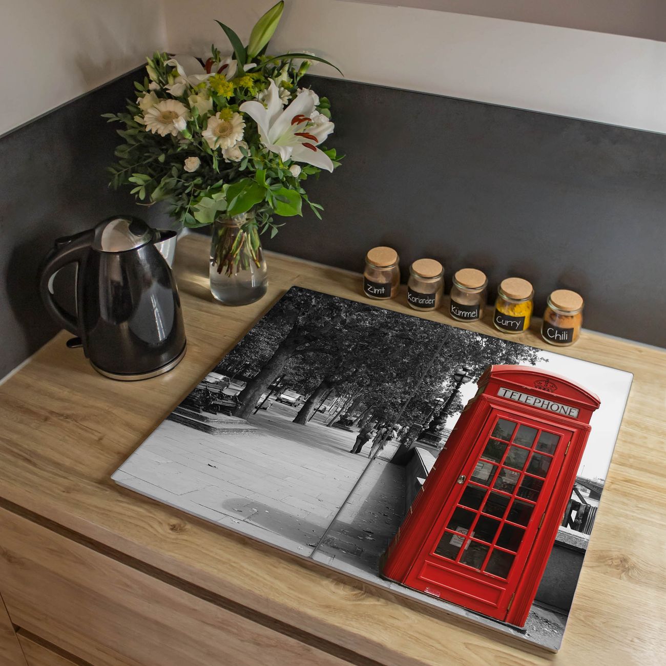 VIELSEITIG: Die Ceranfeldabdeckung ist vielseitig einsetzbar: ob als Spritzschutz hinter dem Herd für Ihre Küche oder als Glas Schneidebrett als hygienische und geruchsneutrale Unterlage. Sie können ebenfalls heiße Töpfe und Pfannen bis 100°C auf der Herdplattenabdeckung abstellen. Sie erhalten ein Multitalent für Ihre Küche. Die banjado Herdabdeckplatte aus Glas mit Motiv London Red Telephone verdeckt mit einem schönen Motiv Ihr Ceranfeld bzw. Ihren Induktionsherd. Die Herdabdeckplatte ist vielseitig einsetzbar und passt sich dabei Ihrem Einrichtungsstil an. DESIGN: Die Herdabdeckung London Red Telephone besteht aus hochwertigem, gehärtetem Glas mit einem unserer zahlreichen Motive. Sie haben die Wahl zwischen verschiedenen Maßen von einteiligen, zweiteiligen und einer dreiteiligen Herdabdeckung. Wählen Sie was zu Ihrer Einrichtung passt! DETAILS: Die Herdabdeckplatte ist vielseitig einsetzbar. Die Ecken sind für mehr Sicherheit dezent abgerundet, das Glas ist gehärtet. Sie erhalten separate Gummi Abstandshalter, damit Ihre Abdeckung rutschfest auf dem Herd steht. Diese können Sie frei positionieren, sodass die Herdabdeckung perfekt auf Ihrem Ceranfeld sitzt. BANJADO: Wir sind ein kleines Team aus dem Herzen von Sachsen und fertigen jeden Artikel nach Bestellung eigens für Sie an. Sie erhalten also keine preiswerte Importware, sondern Handarbeit. Auf Wunsch sind auch andere Farben und Größen möglich, kontakierten Sie uns gern.