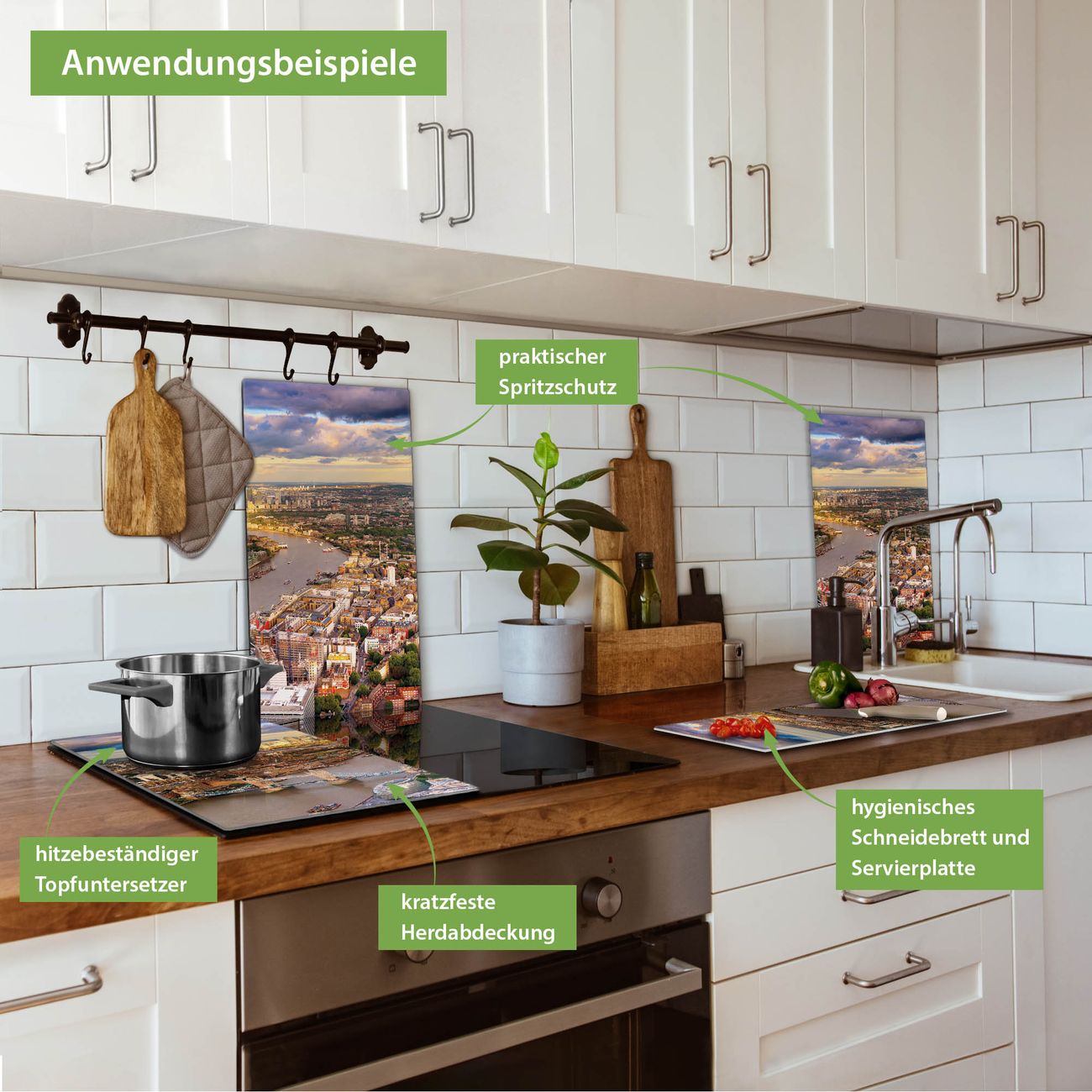 VIELSEITIG: Die Ceranfeldabdeckung ist vielseitig einsetzbar: ob als Spritzschutz hinter dem Herd für Ihre Küche oder als Glas Schneidebrett als hygienische und geruchsneutrale Unterlage. Sie können ebenfalls heiße Töpfe und Pfannen bis 100°C auf der Herdplattenabdeckung abstellen. Sie erhalten ein Multitalent für Ihre Küche. Die banjado Herdabdeckplatte aus Glas mit Motiv London verdeckt mit einem schönen Motiv Ihr Ceranfeld bzw. Ihren Induktionsherd. Die Herdabdeckplatte ist vielseitig einsetzbar und passt sich dabei Ihrem Einrichtungsstil an. DESIGN: Die Herdabdeckung London besteht aus hochwertigem, gehärtetem Glas mit einem unserer zahlreichen Motive. Sie haben die Wahl zwischen verschiedenen Maßen von einteiligen, zweiteiligen und einer dreiteiligen Herdabdeckung. Wählen Sie was zu Ihrer Einrichtung passt! DETAILS: Die Herdabdeckplatte ist vielseitig einsetzbar. Die Ecken sind für mehr Sicherheit dezent abgerundet, das Glas ist gehärtet. Sie erhalten separate Gummi Abstandshalter, damit Ihre Abdeckung rutschfest auf dem Herd steht. Diese können Sie frei positionieren, sodass die Herdabdeckung perfekt auf Ihrem Ceranfeld sitzt. BANJADO: Wir sind ein kleines Team aus dem Herzen von Sachsen und fertigen jeden Artikel nach Bestellung eigens für Sie an. Sie erhalten also keine preiswerte Importware, sondern Handarbeit. Auf Wunsch sind auch andere Farben und Größen möglich, kontakierten Sie uns gern.