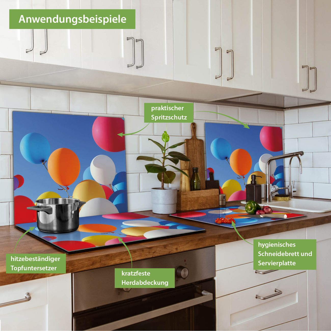 VIELSEITIG: Die Ceranfeldabdeckung ist vielseitig einsetzbar: ob als Spritzschutz hinter dem Herd für Ihre Küche oder als Glas Schneidebrett als hygienische und geruchsneutrale Unterlage. Sie können ebenfalls heiße Töpfe und Pfannen bis 100°C auf der Herdplattenabdeckung abstellen. Sie erhalten ein Multitalent für Ihre Küche. Die banjado Herdabdeckplatte aus Glas mit Motiv Luftballons verdeckt mit einem schönen Motiv Ihr Ceranfeld bzw. Ihren Induktionsherd. Die Herdabdeckplatte ist vielseitig einsetzbar und passt sich dabei Ihrem Einrichtungsstil an. DESIGN: Die Herdabdeckung Luftballons besteht aus hochwertigem, gehärtetem Glas mit einem unserer zahlreichen Motive. Sie haben die Wahl zwischen verschiedenen Maßen von einteiligen, zweiteiligen und einer dreiteiligen Herdabdeckung. Wählen Sie was zu Ihrer Einrichtung passt! DETAILS: Die Herdabdeckplatte ist vielseitig einsetzbar. Die Ecken sind für mehr Sicherheit dezent abgerundet, das Glas ist gehärtet. Sie erhalten separate Gummi Abstandshalter, damit Ihre Abdeckung rutschfest auf dem Herd steht. Diese können Sie frei positionieren, sodass die Herdabdeckung perfekt auf Ihrem Ceranfeld sitzt. BANJADO: Wir sind ein kleines Team aus dem Herzen von Sachsen und fertigen jeden Artikel nach Bestellung eigens für Sie an. Sie erhalten also keine preiswerte Importware, sondern Handarbeit. Auf Wunsch sind auch andere Farben und Größen möglich, kontakierten Sie uns gern.