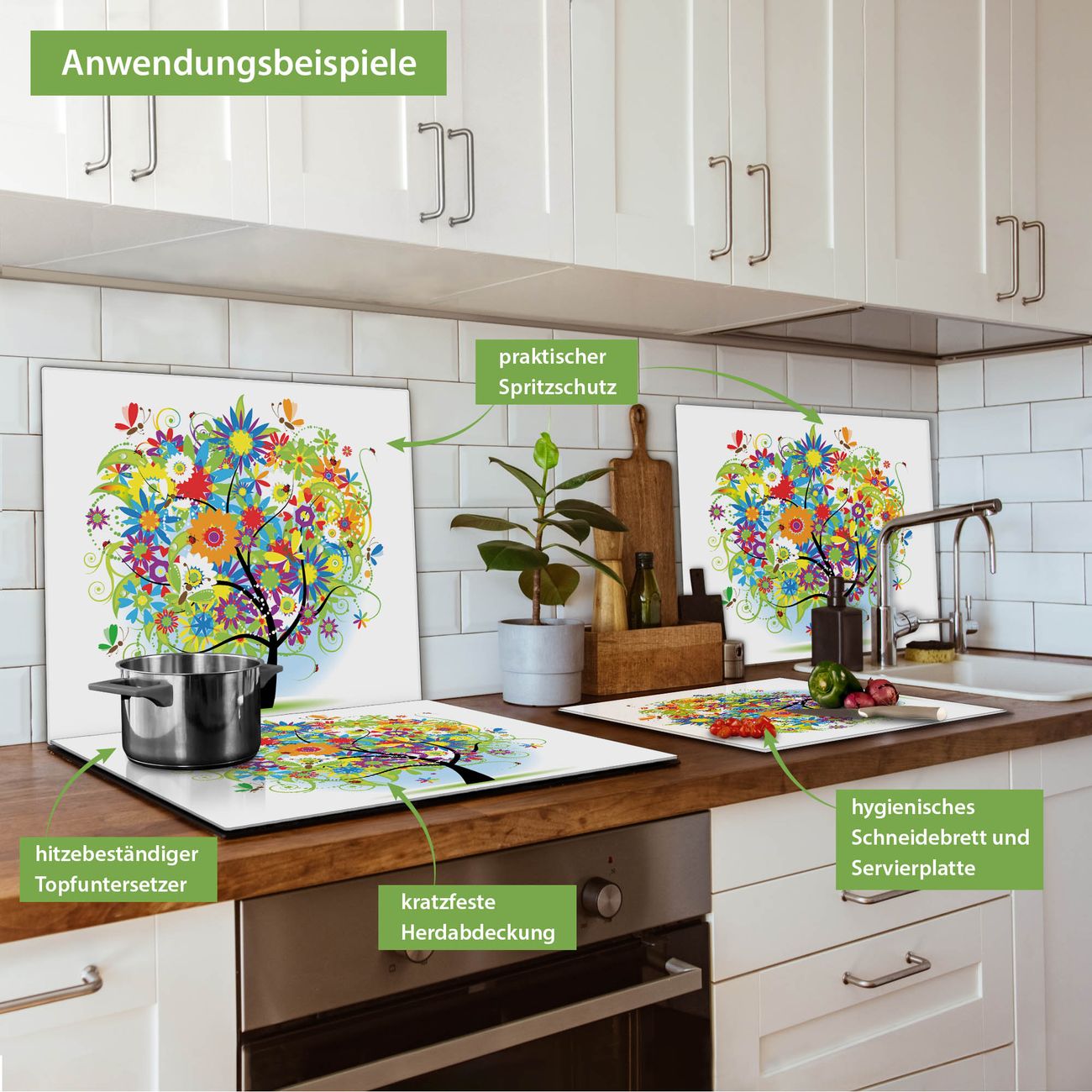 VIELSEITIG: Die Ceranfeldabdeckung ist vielseitig einsetzbar: ob als Spritzschutz hinter dem Herd für Ihre Küche oder als Glas Schneidebrett als hygienische und geruchsneutrale Unterlage. Sie können ebenfalls heiße Töpfe und Pfannen bis 100°C auf der Herdplattenabdeckung abstellen. Sie erhalten ein Multitalent für Ihre Küche. Die banjado Herdabdeckplatte aus Glas mit Motiv Märchenzauberbaum verdeckt mit einem schönen Motiv Ihr Ceranfeld bzw. Ihren Induktionsherd. Die Herdabdeckplatte ist vielseitig einsetzbar und passt sich dabei Ihrem Einrichtungsstil an. DESIGN: Die Herdabdeckung Märchenzauberbaum besteht aus hochwertigem, gehärtetem Glas mit einem unserer zahlreichen Motive. Sie haben die Wahl zwischen verschiedenen Maßen von einteiligen, zweiteiligen und einer dreiteiligen Herdabdeckung. Wählen Sie was zu Ihrer Einrichtung passt! DETAILS: Die Herdabdeckplatte ist vielseitig einsetzbar. Die Ecken sind für mehr Sicherheit dezent abgerundet, das Glas ist gehärtet. Sie erhalten separate Gummi Abstandshalter, damit Ihre Abdeckung rutschfest auf dem Herd steht. Diese können Sie frei positionieren, sodass die Herdabdeckung perfekt auf Ihrem Ceranfeld sitzt. BANJADO: Wir sind ein kleines Team aus dem Herzen von Sachsen und fertigen jeden Artikel nach Bestellung eigens für Sie an. Sie erhalten also keine preiswerte Importware, sondern Handarbeit. Auf Wunsch sind auch andere Farben und Größen möglich, kontakierten Sie uns gern.