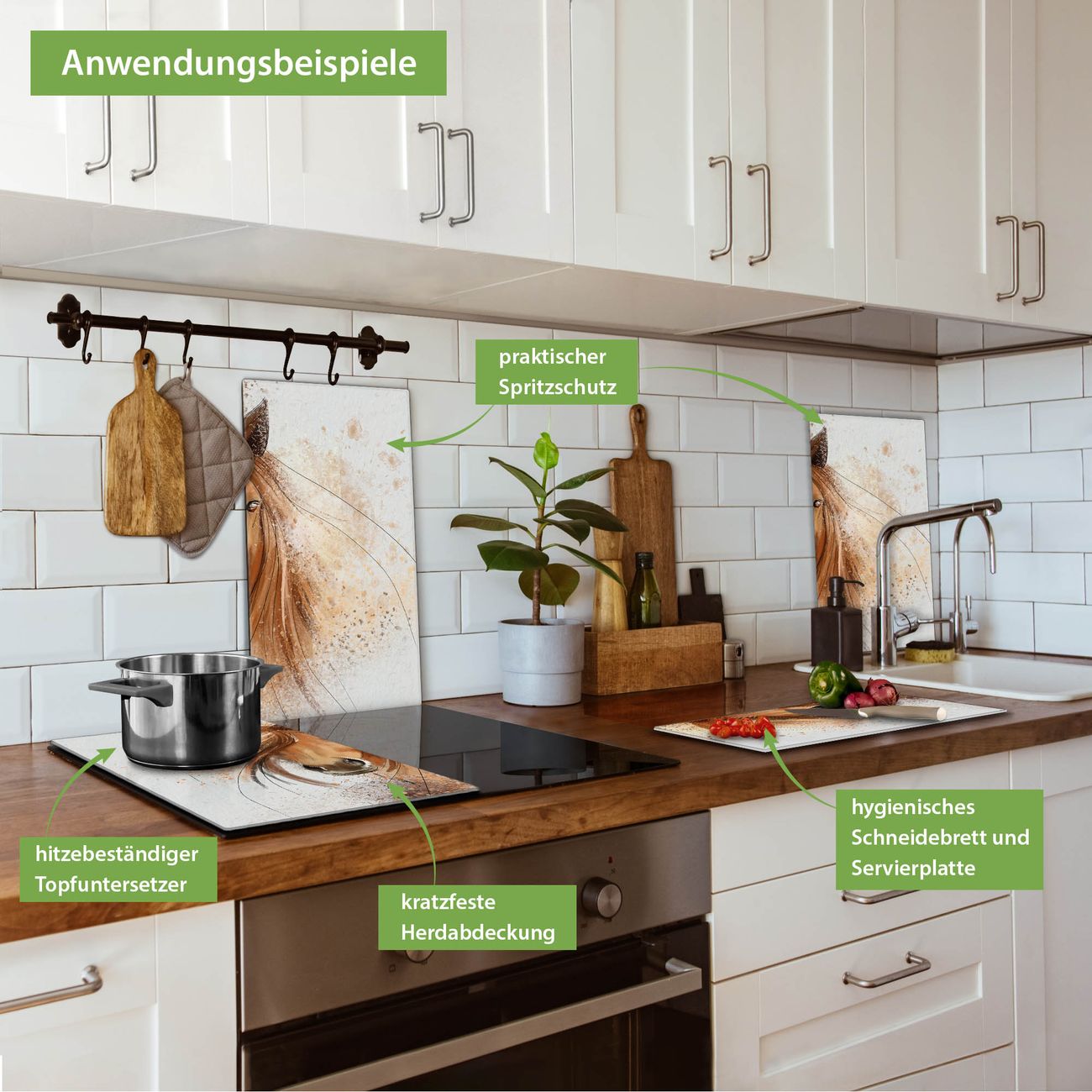 VIELSEITIG: Die Ceranfeldabdeckung ist vielseitig einsetzbar: ob als Spritzschutz hinter dem Herd für Ihre Küche oder als Glas Schneidebrett als hygienische und geruchsneutrale Unterlage. Sie können ebenfalls heiße Töpfe und Pfannen bis 100°C auf der Herdplattenabdeckung abstellen. Sie erhalten ein Multitalent für Ihre Küche. Die banjado Herdabdeckplatte aus Glas mit Motiv Magic Horse verdeckt mit einem schönen Motiv Ihr Ceranfeld bzw. Ihren Induktionsherd. Die Herdabdeckplatte ist vielseitig einsetzbar und passt sich dabei Ihrem Einrichtungsstil an. DESIGN: Die Herdabdeckung Magic Horse besteht aus hochwertigem, gehärtetem Glas mit einem unserer zahlreichen Motive. Sie haben die Wahl zwischen verschiedenen Maßen von einteiligen, zweiteiligen und einer dreiteiligen Herdabdeckung. Wählen Sie was zu Ihrer Einrichtung passt! DETAILS: Die Herdabdeckplatte ist vielseitig einsetzbar. Die Ecken sind für mehr Sicherheit dezent abgerundet, das Glas ist gehärtet. Sie erhalten separate Gummi Abstandshalter, damit Ihre Abdeckung rutschfest auf dem Herd steht. Diese können Sie frei positionieren, sodass die Herdabdeckung perfekt auf Ihrem Ceranfeld sitzt. BANJADO: Wir sind ein kleines Team aus dem Herzen von Sachsen und fertigen jeden Artikel nach Bestellung eigens für Sie an. Sie erhalten also keine preiswerte Importware, sondern Handarbeit. Auf Wunsch sind auch andere Farben und Größen möglich, kontakierten Sie uns gern.