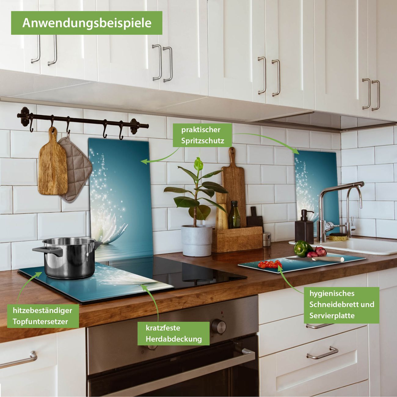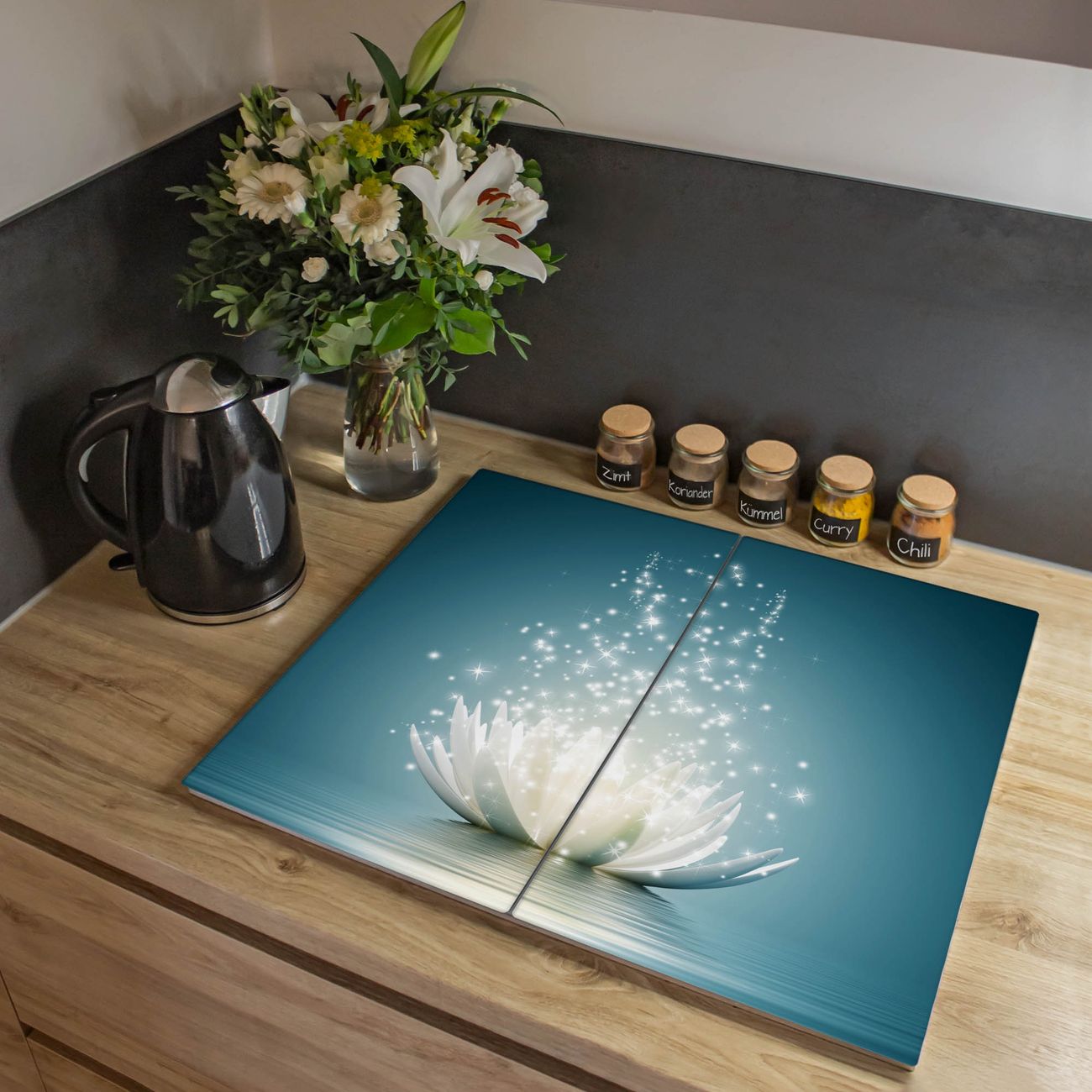 VIELSEITIG: Die Ceranfeldabdeckung ist vielseitig einsetzbar: ob als Spritzschutz hinter dem Herd für Ihre Küche oder als Glas Schneidebrett als hygienische und geruchsneutrale Unterlage. Sie können ebenfalls heiße Töpfe und Pfannen bis 100°C auf der Herdplattenabdeckung abstellen. Sie erhalten ein Multitalent für Ihre Küche. Die banjado Herdabdeckplatte aus Glas mit Motiv Magische Lotusblüte verdeckt mit einem schönen Motiv Ihr Ceranfeld bzw. Ihren Induktionsherd. Die Herdabdeckplatte ist vielseitig einsetzbar und passt sich dabei Ihrem Einrichtungsstil an. DESIGN: Die Herdabdeckung Magische Lotusblüte besteht aus hochwertigem, gehärtetem Glas mit einem unserer zahlreichen Motive. Sie haben die Wahl zwischen verschiedenen Maßen von einteiligen, zweiteiligen und einer dreiteiligen Herdabdeckung. Wählen Sie was zu Ihrer Einrichtung passt! DETAILS: Die Herdabdeckplatte ist vielseitig einsetzbar. Die Ecken sind für mehr Sicherheit dezent abgerundet, das Glas ist gehärtet. Sie erhalten separate Gummi Abstandshalter, damit Ihre Abdeckung rutschfest auf dem Herd steht. Diese können Sie frei positionieren, sodass die Herdabdeckung perfekt auf Ihrem Ceranfeld sitzt. BANJADO: Wir sind ein kleines Team aus dem Herzen von Sachsen und fertigen jeden Artikel nach Bestellung eigens für Sie an. Sie erhalten also keine preiswerte Importware, sondern Handarbeit. Auf Wunsch sind auch andere Farben und Größen möglich, kontakierten Sie uns gern.