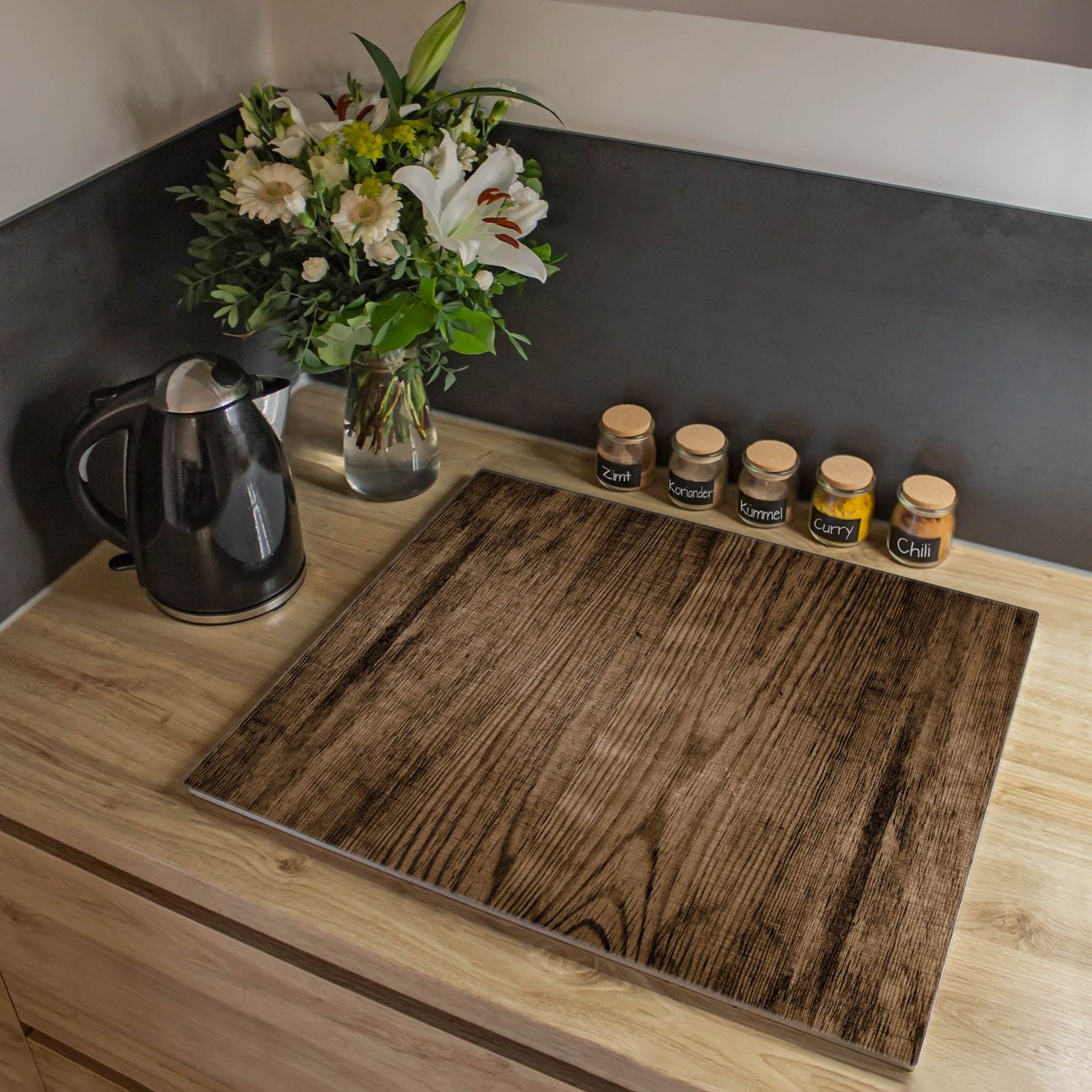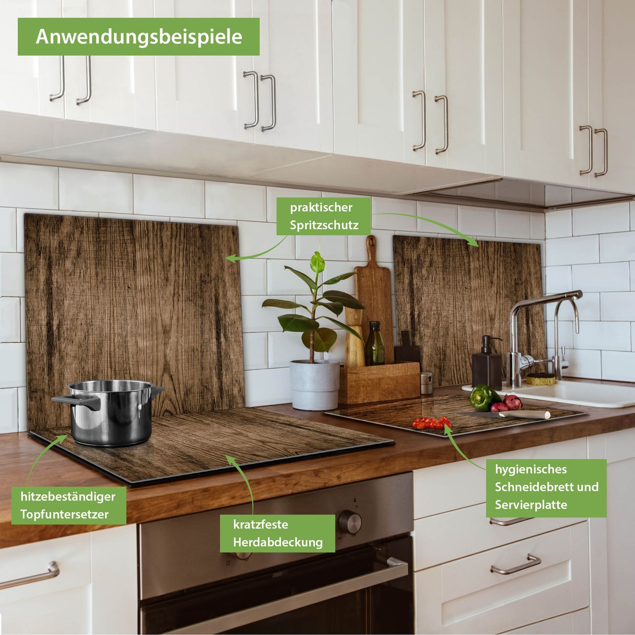 VIELSEITIG: Die Ceranfeldabdeckung ist vielseitig einsetzbar: ob als Spritzschutz hinter dem Herd für Ihre Küche oder als Glas Schneidebrett als hygienische und geruchsneutrale Unterlage. Sie können ebenfalls heiße Töpfe und Pfannen bis 100°C auf der Herdplattenabdeckung abstellen. Sie erhalten ein Multitalent für Ihre Küche. Die banjado Herdabdeckplatte aus Glas mit Motiv Maserung Dunkel verdeckt mit einem schönen Motiv Ihr Ceranfeld bzw. Ihren Induktionsherd. Die Herdabdeckplatte ist vielseitig einsetzbar und passt sich dabei Ihrem Einrichtungsstil an. DESIGN: Die Herdabdeckung Maserung Dunkel besteht aus hochwertigem, gehärtetem Glas mit einem unserer zahlreichen Motive. Sie haben die Wahl zwischen verschiedenen Maßen von einteiligen, zweiteiligen und einer dreiteiligen Herdabdeckung. Wählen Sie was zu Ihrer Einrichtung passt! DETAILS: Die Herdabdeckplatte ist vielseitig einsetzbar. Die Ecken sind für mehr Sicherheit dezent abgerundet, das Glas ist gehärtet. Sie erhalten separate Gummi Abstandshalter, damit Ihre Abdeckung rutschfest auf dem Herd steht. Diese können Sie frei positionieren, sodass die Herdabdeckung perfekt auf Ihrem Ceranfeld sitzt. BANJADO: Wir sind ein kleines Team aus dem Herzen von Sachsen und fertigen jeden Artikel nach Bestellung eigens für Sie an. Sie erhalten also keine preiswerte Importware, sondern Handarbeit. Auf Wunsch sind auch andere Farben und Größen möglich, kontakierten Sie uns gern.