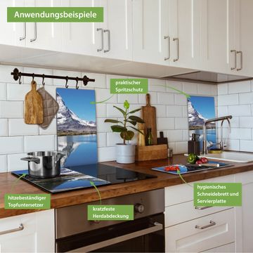 VIELSEITIG: Die Ceranfeldabdeckung ist vielseitig einsetzbar: ob als Spritzschutz hinter dem Herd für Ihre Küche oder als Glas Schneidebrett als hygienische und geruchsneutrale Unterlage. Sie können ebenfalls heiße Töpfe und Pfannen bis 100°C auf der Herdplattenabdeckung abstellen. Sie erhalten ein Multitalent für Ihre Küche. Die banjado Herdabdeckplatte aus Glas mit Motiv Matterhorn verdeckt mit einem schönen Motiv Ihr Ceranfeld bzw. Ihren Induktionsherd. Die Herdabdeckplatte ist vielseitig einsetzbar und passt sich dabei Ihrem Einrichtungsstil an. DESIGN: Die Herdabdeckung Matterhorn besteht aus hochwertigem, gehärtetem Glas mit einem unserer zahlreichen Motive. Sie haben die Wahl zwischen verschiedenen Maßen von einteiligen, zweiteiligen und einer dreiteiligen Herdabdeckung. Wählen Sie was zu Ihrer Einrichtung passt! DETAILS: Die Herdabdeckplatte ist vielseitig einsetzbar. Die Ecken sind für mehr Sicherheit dezent abgerundet, das Glas ist gehärtet. Sie erhalten separate Gummi Abstandshalter, damit Ihre Abdeckung rutschfest auf dem Herd steht. Diese können Sie frei positionieren, sodass die Herdabdeckung perfekt auf Ihrem Ceranfeld sitzt. BANJADO: Wir sind ein kleines Team aus dem Herzen von Sachsen und fertigen jeden Artikel nach Bestellung eigens für Sie an. Sie erhalten also keine preiswerte Importware, sondern Handarbeit. Auf Wunsch sind auch andere Farben und Größen möglich, kontakierten Sie uns gern.