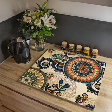 VIELSEITIG: Die Ceranfeldabdeckung ist vielseitig einsetzbar: ob als Spritzschutz hinter dem Herd für Ihre Küche oder als Glas Schneidebrett als hygienische und geruchsneutrale Unterlage. Sie können ebenfalls heiße Töpfe und Pfannen bis 100°C auf der Herdplattenabdeckung abstellen. Sie erhalten ein Multitalent für Ihre Küche. Die banjado Herdabdeckplatte aus Glas mit Motiv Modernes Mandala verdeckt mit einem schönen Motiv Ihr Ceranfeld bzw. Ihren Induktionsherd. Die Herdabdeckplatte ist vielseitig einsetzbar und passt sich dabei Ihrem Einrichtungsstil an. DESIGN: Die Herdabdeckung Modernes Mandala besteht aus hochwertigem, gehärtetem Glas mit einem unserer zahlreichen Motive. Sie haben die Wahl zwischen verschiedenen Maßen von einteiligen, zweiteiligen und einer dreiteiligen Herdabdeckung. Wählen Sie was zu Ihrer Einrichtung passt! DETAILS: Die Herdabdeckplatte ist vielseitig einsetzbar. Die Ecken sind für mehr Sicherheit dezent abgerundet, das Glas ist gehärtet. Sie erhalten separate Gummi Abstandshalter, damit Ihre Abdeckung rutschfest auf dem Herd steht. Diese können Sie frei positionieren, sodass die Herdabdeckung perfekt auf Ihrem Ceranfeld sitzt. BANJADO: Wir sind ein kleines Team aus dem Herzen von Sachsen und fertigen jeden Artikel nach Bestellung eigens für Sie an. Sie erhalten also keine preiswerte Importware, sondern Handarbeit. Auf Wunsch sind auch andere Farben und Größen möglich, kontakierten Sie uns gern.