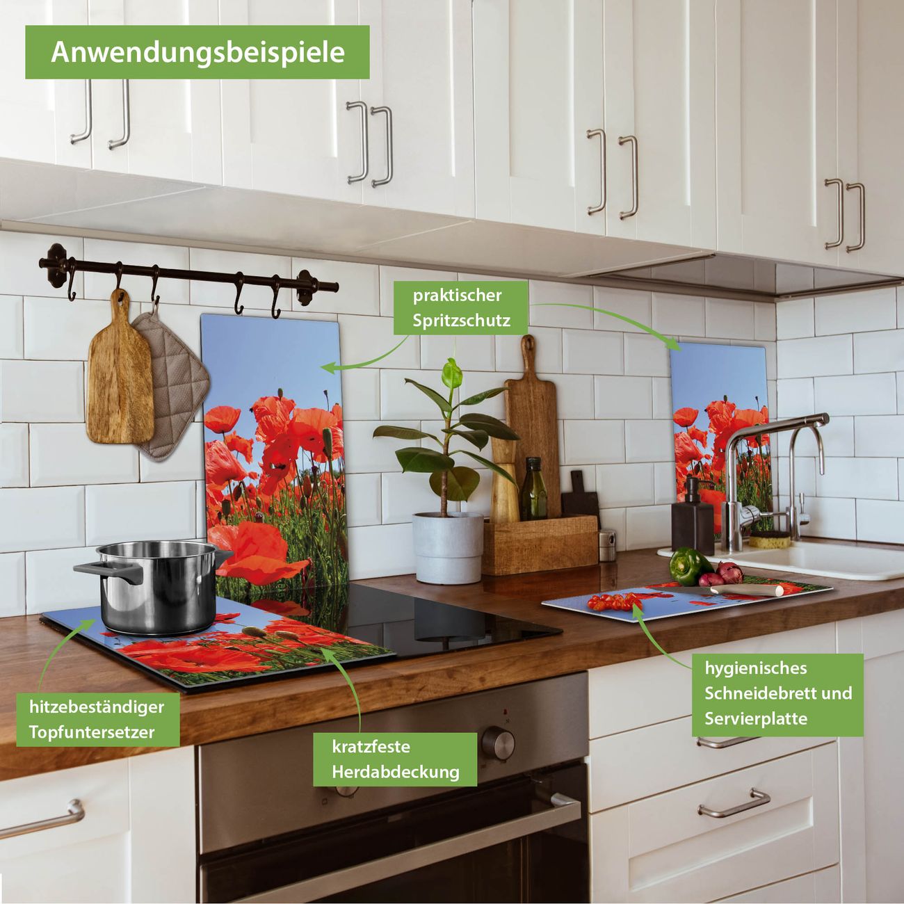 VIELSEITIG: Die Ceranfeldabdeckung ist vielseitig einsetzbar: ob als Spritzschutz hinter dem Herd für Ihre Küche oder als Glas Schneidebrett als hygienische und geruchsneutrale Unterlage. Sie können ebenfalls heiße Töpfe und Pfannen bis 100°C auf der Herdplattenabdeckung abstellen. Sie erhalten ein Multitalent für Ihre Küche. Die banjado Herdabdeckplatte aus Glas mit Motiv Mohnblumen verdeckt mit einem schönen Motiv Ihr Ceranfeld bzw. Ihren Induktionsherd. Die Herdabdeckplatte ist vielseitig einsetzbar und passt sich dabei Ihrem Einrichtungsstil an. DESIGN: Die Herdabdeckung Mohnblumen besteht aus hochwertigem, gehärtetem Glas mit einem unserer zahlreichen Motive. Sie haben die Wahl zwischen verschiedenen Maßen von einteiligen, zweiteiligen und einer dreiteiligen Herdabdeckung. Wählen Sie was zu Ihrer Einrichtung passt! DETAILS: Die Herdabdeckplatte ist vielseitig einsetzbar. Die Ecken sind für mehr Sicherheit dezent abgerundet, das Glas ist gehärtet. Sie erhalten separate Gummi Abstandshalter, damit Ihre Abdeckung rutschfest auf dem Herd steht. Diese können Sie frei positionieren, sodass die Herdabdeckung perfekt auf Ihrem Ceranfeld sitzt. BANJADO: Wir sind ein kleines Team aus dem Herzen von Sachsen und fertigen jeden Artikel nach Bestellung eigens für Sie an. Sie erhalten also keine preiswerte Importware, sondern Handarbeit. Auf Wunsch sind auch andere Farben und Größen möglich, kontakierten Sie uns gern.