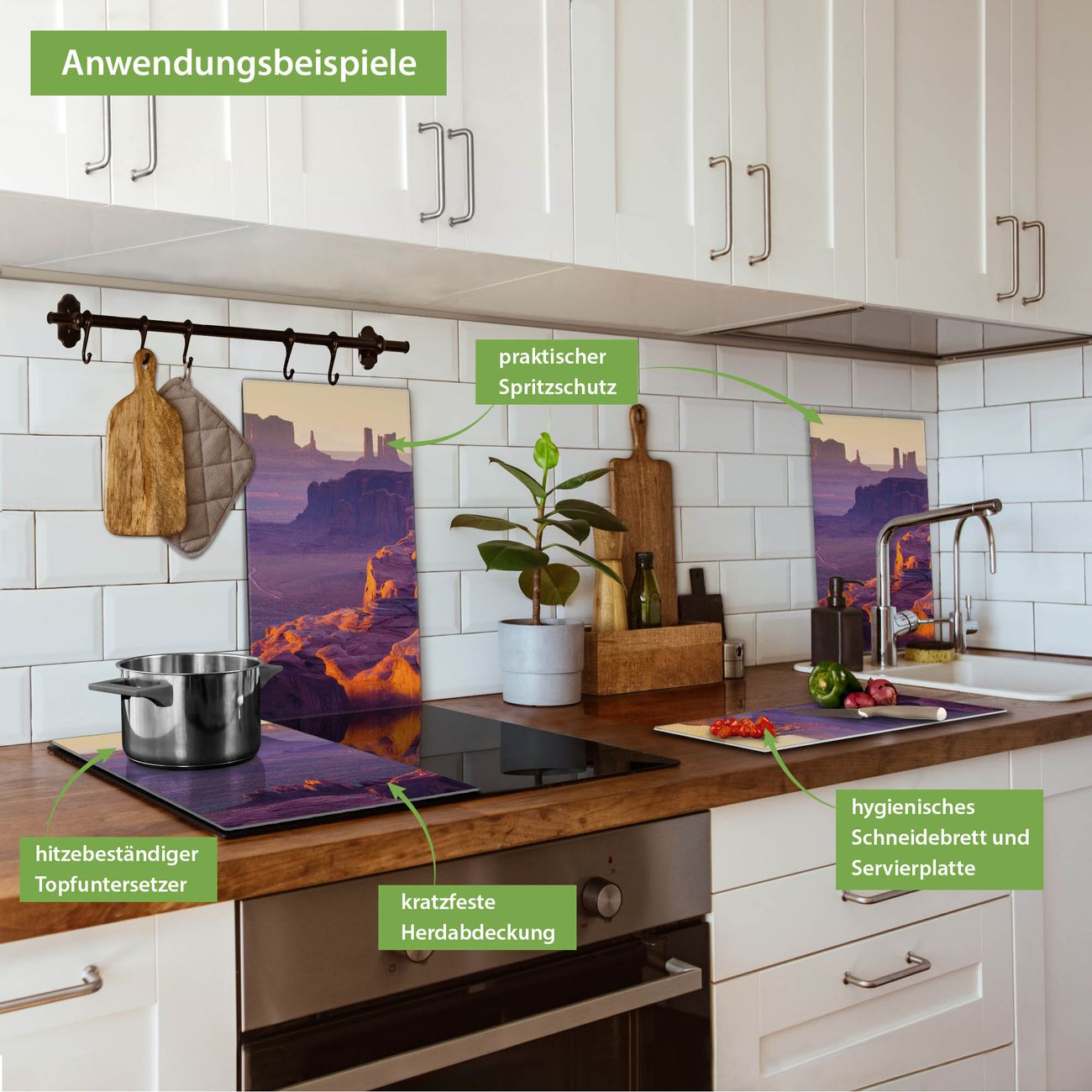 VIELSEITIG: Die Ceranfeldabdeckung ist vielseitig einsetzbar: ob als Spritzschutz hinter dem Herd für Ihre Küche oder als Glas Schneidebrett als hygienische und geruchsneutrale Unterlage. Sie können ebenfalls heiße Töpfe und Pfannen bis 100°C auf der Herdplattenabdeckung abstellen. Sie erhalten ein Multitalent für Ihre Küche. Die banjado Herdabdeckplatte aus Glas mit Motiv Monument Valley verdeckt mit einem schönen Motiv Ihr Ceranfeld bzw. Ihren Induktionsherd. Die Herdabdeckplatte ist vielseitig einsetzbar und passt sich dabei Ihrem Einrichtungsstil an. DESIGN: Die Herdabdeckung Monument Valley besteht aus hochwertigem, gehärtetem Glas mit einem unserer zahlreichen Motive. Sie haben die Wahl zwischen verschiedenen Maßen von einteiligen, zweiteiligen und einer dreiteiligen Herdabdeckung. Wählen Sie was zu Ihrer Einrichtung passt! DETAILS: Die Herdabdeckplatte ist vielseitig einsetzbar. Die Ecken sind für mehr Sicherheit dezent abgerundet, das Glas ist gehärtet. Sie erhalten separate Gummi Abstandshalter, damit Ihre Abdeckung rutschfest auf dem Herd steht. Diese können Sie frei positionieren, sodass die Herdabdeckung perfekt auf Ihrem Ceranfeld sitzt. BANJADO: Wir sind ein kleines Team aus dem Herzen von Sachsen und fertigen jeden Artikel nach Bestellung eigens für Sie an. Sie erhalten also keine preiswerte Importware, sondern Handarbeit. Auf Wunsch sind auch andere Farben und Größen möglich, kontakierten Sie uns gern.