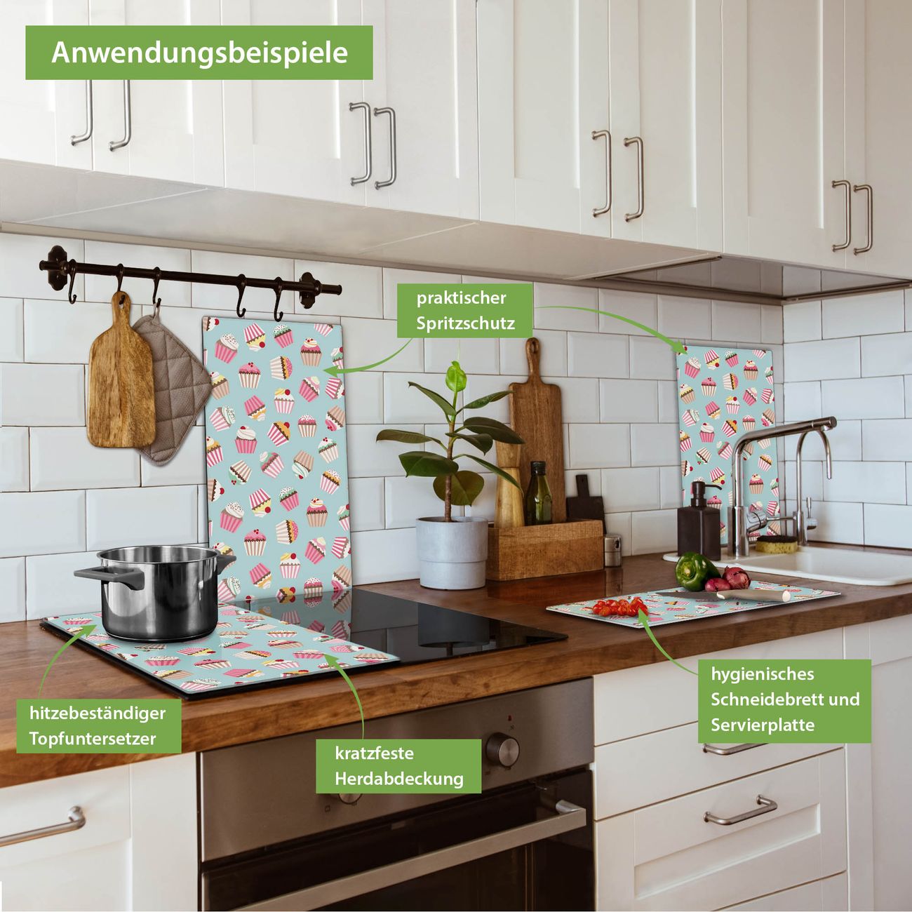 VIELSEITIG: Die Ceranfeldabdeckung ist vielseitig einsetzbar: ob als Spritzschutz hinter dem Herd für Ihre Küche oder als Glas Schneidebrett als hygienische und geruchsneutrale Unterlage. Sie können ebenfalls heiße Töpfe und Pfannen bis 100°C auf der Herdplattenabdeckung abstellen. Sie erhalten ein Multitalent für Ihre Küche. Die banjado Herdabdeckplatte aus Glas mit Motiv Muffins verdeckt mit einem schönen Motiv Ihr Ceranfeld bzw. Ihren Induktionsherd. Die Herdabdeckplatte ist vielseitig einsetzbar und passt sich dabei Ihrem Einrichtungsstil an. DESIGN: Die Herdabdeckung Muffins besteht aus hochwertigem, gehärtetem Glas mit einem unserer zahlreichen Motive. Sie haben die Wahl zwischen verschiedenen Maßen von einteiligen, zweiteiligen und einer dreiteiligen Herdabdeckung. Wählen Sie was zu Ihrer Einrichtung passt! DETAILS: Die Herdabdeckplatte ist vielseitig einsetzbar. Die Ecken sind für mehr Sicherheit dezent abgerundet, das Glas ist gehärtet. Sie erhalten separate Gummi Abstandshalter, damit Ihre Abdeckung rutschfest auf dem Herd steht. Diese können Sie frei positionieren, sodass die Herdabdeckung perfekt auf Ihrem Ceranfeld sitzt. BANJADO: Wir sind ein kleines Team aus dem Herzen von Sachsen und fertigen jeden Artikel nach Bestellung eigens für Sie an. Sie erhalten also keine preiswerte Importware, sondern Handarbeit. Auf Wunsch sind auch andere Farben und Größen möglich, kontakierten Sie uns gern.