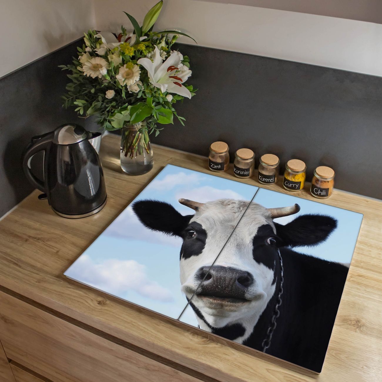 VIELSEITIG: Die Ceranfeldabdeckung ist vielseitig einsetzbar: ob als Spritzschutz hinter dem Herd für Ihre Küche oder als Glas Schneidebrett als hygienische und geruchsneutrale Unterlage. Sie können ebenfalls heiße Töpfe und Pfannen bis 100°C auf der Herdplattenabdeckung abstellen. Sie erhalten ein Multitalent für Ihre Küche. Die banjado Herdabdeckplatte aus Glas mit Motiv Muh verdeckt mit einem schönen Motiv Ihr Ceranfeld bzw. Ihren Induktionsherd. Die Herdabdeckplatte ist vielseitig einsetzbar und passt sich dabei Ihrem Einrichtungsstil an. DESIGN: Die Herdabdeckung Muh besteht aus hochwertigem, gehärtetem Glas mit einem unserer zahlreichen Motive. Sie haben die Wahl zwischen verschiedenen Maßen von einteiligen, zweiteiligen und einer dreiteiligen Herdabdeckung. Wählen Sie was zu Ihrer Einrichtung passt! DETAILS: Die Herdabdeckplatte ist vielseitig einsetzbar. Die Ecken sind für mehr Sicherheit dezent abgerundet, das Glas ist gehärtet. Sie erhalten separate Gummi Abstandshalter, damit Ihre Abdeckung rutschfest auf dem Herd steht. Diese können Sie frei positionieren, sodass die Herdabdeckung perfekt auf Ihrem Ceranfeld sitzt. BANJADO: Wir sind ein kleines Team aus dem Herzen von Sachsen und fertigen jeden Artikel nach Bestellung eigens für Sie an. Sie erhalten also keine preiswerte Importware, sondern Handarbeit. Auf Wunsch sind auch andere Farben und Größen möglich, kontakierten Sie uns gern.