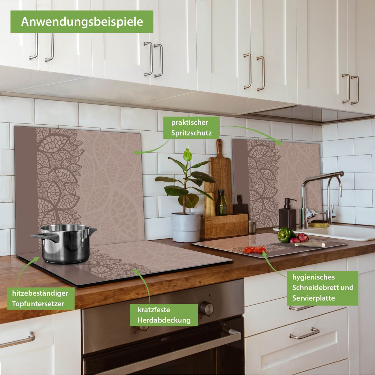 VIELSEITIG: Die Ceranfeldabdeckung ist vielseitig einsetzbar: ob als Spritzschutz hinter dem Herd für Ihre Küche oder als Glas Schneidebrett als hygienische und geruchsneutrale Unterlage. Sie können ebenfalls heiße Töpfe und Pfannen bis 100°C auf der Herdplattenabdeckung abstellen. Sie erhalten ein Multitalent für Ihre Küche. Die banjado Herdabdeckplatte aus Glas mit Motiv Muster Blätter verdeckt mit einem schönen Motiv Ihr Ceranfeld bzw. Ihren Induktionsherd. Die Herdabdeckplatte ist vielseitig einsetzbar und passt sich dabei Ihrem Einrichtungsstil an. DESIGN: Die Herdabdeckung Muster Blätter besteht aus hochwertigem, gehärtetem Glas mit einem unserer zahlreichen Motive. Sie haben die Wahl zwischen verschiedenen Maßen von einteiligen, zweiteiligen und einer dreiteiligen Herdabdeckung. Wählen Sie was zu Ihrer Einrichtung passt! DETAILS: Die Herdabdeckplatte ist vielseitig einsetzbar. Die Ecken sind für mehr Sicherheit dezent abgerundet, das Glas ist gehärtet. Sie erhalten separate Gummi Abstandshalter, damit Ihre Abdeckung rutschfest auf dem Herd steht. Diese können Sie frei positionieren, sodass die Herdabdeckung perfekt auf Ihrem Ceranfeld sitzt. BANJADO: Wir sind ein kleines Team aus dem Herzen von Sachsen und fertigen jeden Artikel nach Bestellung eigens für Sie an. Sie erhalten also keine preiswerte Importware, sondern Handarbeit. Auf Wunsch sind auch andere Farben und Größen möglich, kontakierten Sie uns gern.