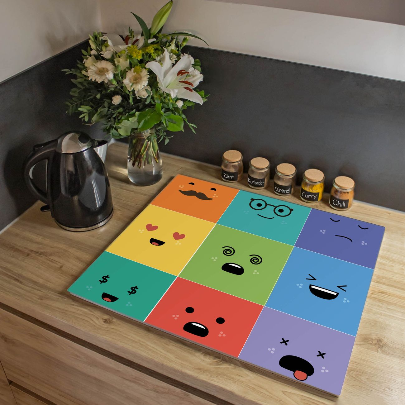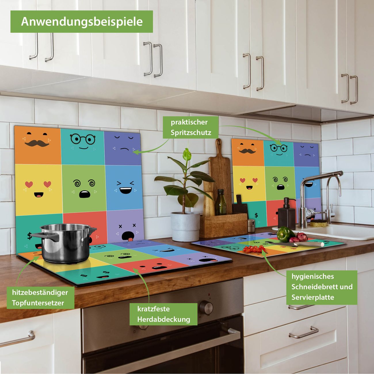 VIELSEITIG: Die Ceranfeldabdeckung ist vielseitig einsetzbar: ob als Spritzschutz hinter dem Herd für Ihre Küche oder als Glas Schneidebrett als hygienische und geruchsneutrale Unterlage. Sie können ebenfalls heiße Töpfe und Pfannen bis 100°C auf der Herdplattenabdeckung abstellen. Sie erhalten ein Multitalent für Ihre Küche. Die banjado Herdabdeckplatte aus Glas mit Motiv Neun Keinenasen verdeckt mit einem schönen Motiv Ihr Ceranfeld bzw. Ihren Induktionsherd. Die Herdabdeckplatte ist vielseitig einsetzbar und passt sich dabei Ihrem Einrichtungsstil an. DESIGN: Die Herdabdeckung Neun Keinenasen besteht aus hochwertigem, gehärtetem Glas mit einem unserer zahlreichen Motive. Sie haben die Wahl zwischen verschiedenen Maßen von einteiligen, zweiteiligen und einer dreiteiligen Herdabdeckung. Wählen Sie was zu Ihrer Einrichtung passt! DETAILS: Die Herdabdeckplatte ist vielseitig einsetzbar. Die Ecken sind für mehr Sicherheit dezent abgerundet, das Glas ist gehärtet. Sie erhalten separate Gummi Abstandshalter, damit Ihre Abdeckung rutschfest auf dem Herd steht. Diese können Sie frei positionieren, sodass die Herdabdeckung perfekt auf Ihrem Ceranfeld sitzt. BANJADO: Wir sind ein kleines Team aus dem Herzen von Sachsen und fertigen jeden Artikel nach Bestellung eigens für Sie an. Sie erhalten also keine preiswerte Importware, sondern Handarbeit. Auf Wunsch sind auch andere Farben und Größen möglich, kontakierten Sie uns gern.