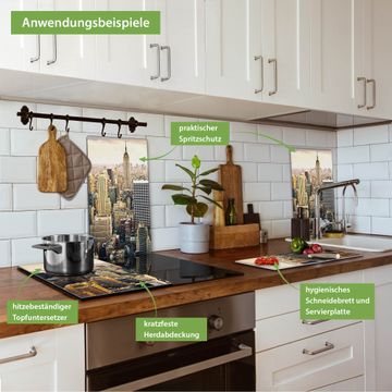VIELSEITIG: Die Ceranfeldabdeckung ist vielseitig einsetzbar: ob als Spritzschutz hinter dem Herd für Ihre Küche oder als Glas Schneidebrett als hygienische und geruchsneutrale Unterlage. Sie können ebenfalls heiße Töpfe und Pfannen bis 100°C auf der Herdplattenabdeckung abstellen. Sie erhalten ein Multitalent für Ihre Küche. Die banjado Herdabdeckplatte aus Glas mit Motiv New York City verdeckt mit einem schönen Motiv Ihr Ceranfeld bzw. Ihren Induktionsherd. Die Herdabdeckplatte ist vielseitig einsetzbar und passt sich dabei Ihrem Einrichtungsstil an. DESIGN: Die Herdabdeckung New York City besteht aus hochwertigem, gehärtetem Glas mit einem unserer zahlreichen Motive. Sie haben die Wahl zwischen verschiedenen Maßen von einteiligen, zweiteiligen und einer dreiteiligen Herdabdeckung. Wählen Sie was zu Ihrer Einrichtung passt! DETAILS: Die Herdabdeckplatte ist vielseitig einsetzbar. Die Ecken sind für mehr Sicherheit dezent abgerundet, das Glas ist gehärtet. Sie erhalten separate Gummi Abstandshalter, damit Ihre Abdeckung rutschfest auf dem Herd steht. Diese können Sie frei positionieren, sodass die Herdabdeckung perfekt auf Ihrem Ceranfeld sitzt. BANJADO: Wir sind ein kleines Team aus dem Herzen von Sachsen und fertigen jeden Artikel nach Bestellung eigens für Sie an. Sie erhalten also keine preiswerte Importware, sondern Handarbeit. Auf Wunsch sind auch andere Farben und Größen möglich, kontakierten Sie uns gern.