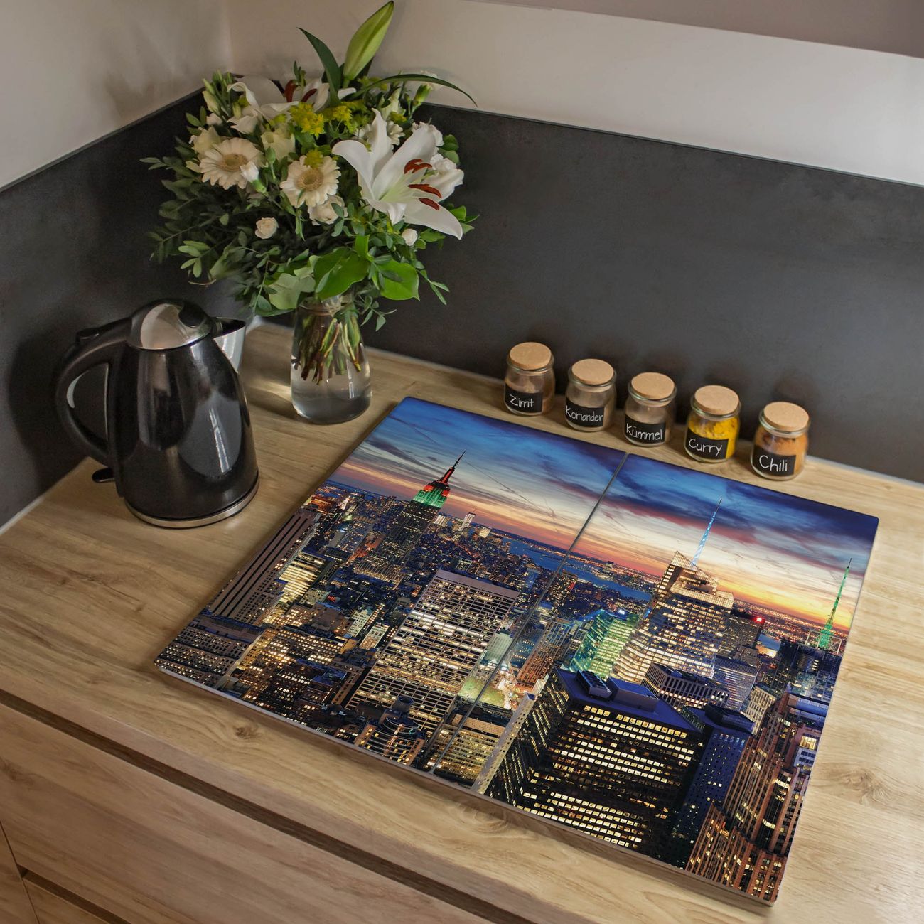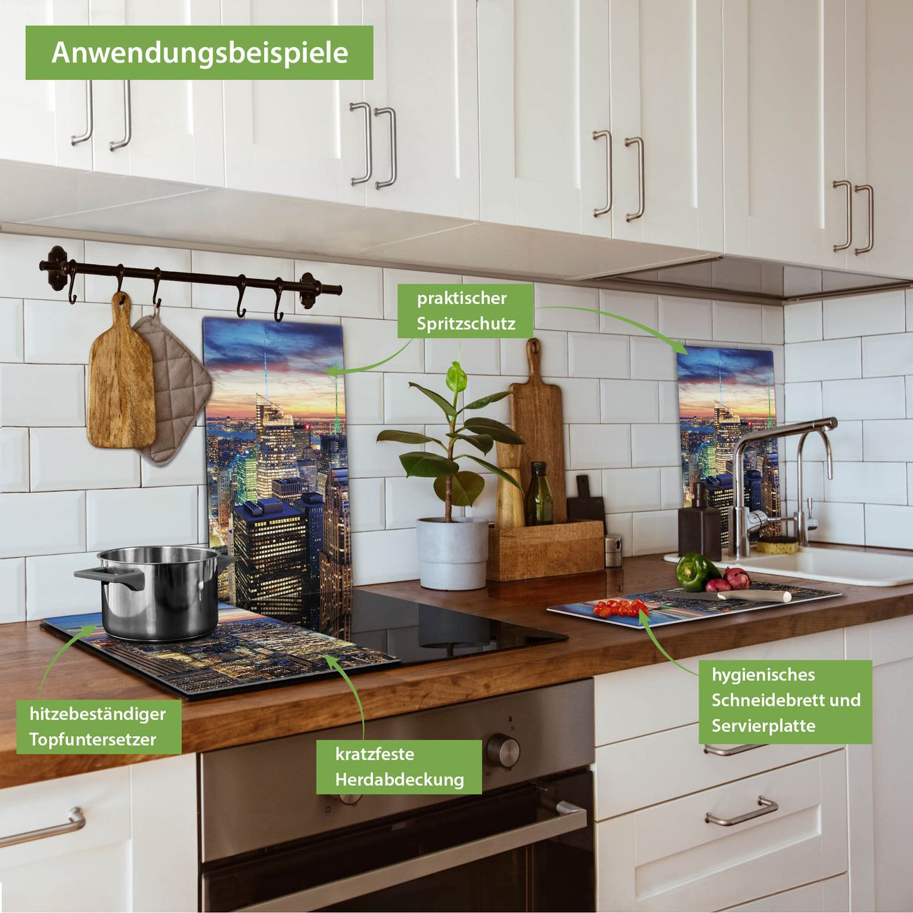 VIELSEITIG: Die Ceranfeldabdeckung ist vielseitig einsetzbar: ob als Spritzschutz hinter dem Herd für Ihre Küche oder als Glas Schneidebrett als hygienische und geruchsneutrale Unterlage. Sie können ebenfalls heiße Töpfe und Pfannen bis 100°C auf der Herdplattenabdeckung abstellen. Sie erhalten ein Multitalent für Ihre Küche. Die banjado Herdabdeckplatte aus Glas mit Motiv New York Sunset verdeckt mit einem schönen Motiv Ihr Ceranfeld bzw. Ihren Induktionsherd. Die Herdabdeckplatte ist vielseitig einsetzbar und passt sich dabei Ihrem Einrichtungsstil an. DESIGN: Die Herdabdeckung New York Sunset besteht aus hochwertigem, gehärtetem Glas mit einem unserer zahlreichen Motive. Sie haben die Wahl zwischen verschiedenen Maßen von einteiligen, zweiteiligen und einer dreiteiligen Herdabdeckung. Wählen Sie was zu Ihrer Einrichtung passt! DETAILS: Die Herdabdeckplatte ist vielseitig einsetzbar. Die Ecken sind für mehr Sicherheit dezent abgerundet, das Glas ist gehärtet. Sie erhalten separate Gummi Abstandshalter, damit Ihre Abdeckung rutschfest auf dem Herd steht. Diese können Sie frei positionieren, sodass die Herdabdeckung perfekt auf Ihrem Ceranfeld sitzt. BANJADO: Wir sind ein kleines Team aus dem Herzen von Sachsen und fertigen jeden Artikel nach Bestellung eigens für Sie an. Sie erhalten also keine preiswerte Importware, sondern Handarbeit. Auf Wunsch sind auch andere Farben und Größen möglich, kontakierten Sie uns gern.