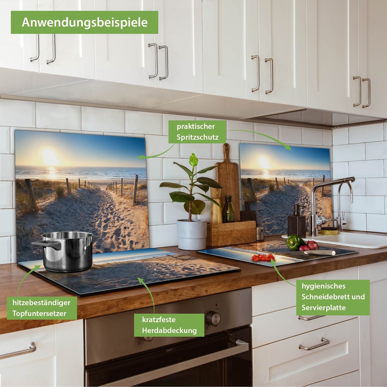 VIELSEITIG: Die Ceranfeldabdeckung ist vielseitig einsetzbar: ob als Spritzschutz hinter dem Herd für Ihre Küche oder als Glas Schneidebrett als hygienische und geruchsneutrale Unterlage. Sie können ebenfalls heiße Töpfe und Pfannen bis 100°C auf der Herdplattenabdeckung abstellen. Sie erhalten ein Multitalent für Ihre Küche. Die banjado Herdabdeckplatte aus Glas mit Motiv Nordseestrand verdeckt mit einem schönen Motiv Ihr Ceranfeld bzw. Ihren Induktionsherd. Die Herdabdeckplatte ist vielseitig einsetzbar und passt sich dabei Ihrem Einrichtungsstil an. DESIGN: Die Herdabdeckung Nordseestrand besteht aus hochwertigem, gehärtetem Glas mit einem unserer zahlreichen Motive. Sie haben die Wahl zwischen verschiedenen Maßen von einteiligen, zweiteiligen und einer dreiteiligen Herdabdeckung. Wählen Sie was zu Ihrer Einrichtung passt! DETAILS: Die Herdabdeckplatte ist vielseitig einsetzbar. Die Ecken sind für mehr Sicherheit dezent abgerundet, das Glas ist gehärtet. Sie erhalten separate Gummi Abstandshalter, damit Ihre Abdeckung rutschfest auf dem Herd steht. Diese können Sie frei positionieren, sodass die Herdabdeckung perfekt auf Ihrem Ceranfeld sitzt. BANJADO: Wir sind ein kleines Team aus dem Herzen von Sachsen und fertigen jeden Artikel nach Bestellung eigens für Sie an. Sie erhalten also keine preiswerte Importware, sondern Handarbeit. Auf Wunsch sind auch andere Farben und Größen möglich, kontakierten Sie uns gern.