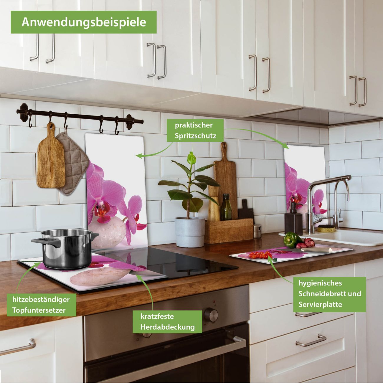 VIELSEITIG: Die Ceranfeldabdeckung ist vielseitig einsetzbar: ob als Spritzschutz hinter dem Herd für Ihre Küche oder als Glas Schneidebrett als hygienische und geruchsneutrale Unterlage. Sie können ebenfalls heiße Töpfe und Pfannen bis 100°C auf der Herdplattenabdeckung abstellen. Sie erhalten ein Multitalent für Ihre Küche. Die banjado Herdabdeckplatte aus Glas mit Motiv Orchidee verdeckt mit einem schönen Motiv Ihr Ceranfeld bzw. Ihren Induktionsherd. Die Herdabdeckplatte ist vielseitig einsetzbar und passt sich dabei Ihrem Einrichtungsstil an. DESIGN: Die Herdabdeckung Orchidee besteht aus hochwertigem, gehärtetem Glas mit einem unserer zahlreichen Motive. Sie haben die Wahl zwischen verschiedenen Maßen von einteiligen, zweiteiligen und einer dreiteiligen Herdabdeckung. Wählen Sie was zu Ihrer Einrichtung passt! DETAILS: Die Herdabdeckplatte ist vielseitig einsetzbar. Die Ecken sind für mehr Sicherheit dezent abgerundet, das Glas ist gehärtet. Sie erhalten separate Gummi Abstandshalter, damit Ihre Abdeckung rutschfest auf dem Herd steht. Diese können Sie frei positionieren, sodass die Herdabdeckung perfekt auf Ihrem Ceranfeld sitzt. BANJADO: Wir sind ein kleines Team aus dem Herzen von Sachsen und fertigen jeden Artikel nach Bestellung eigens für Sie an. Sie erhalten also keine preiswerte Importware, sondern Handarbeit. Auf Wunsch sind auch andere Farben und Größen möglich, kontakierten Sie uns gern.