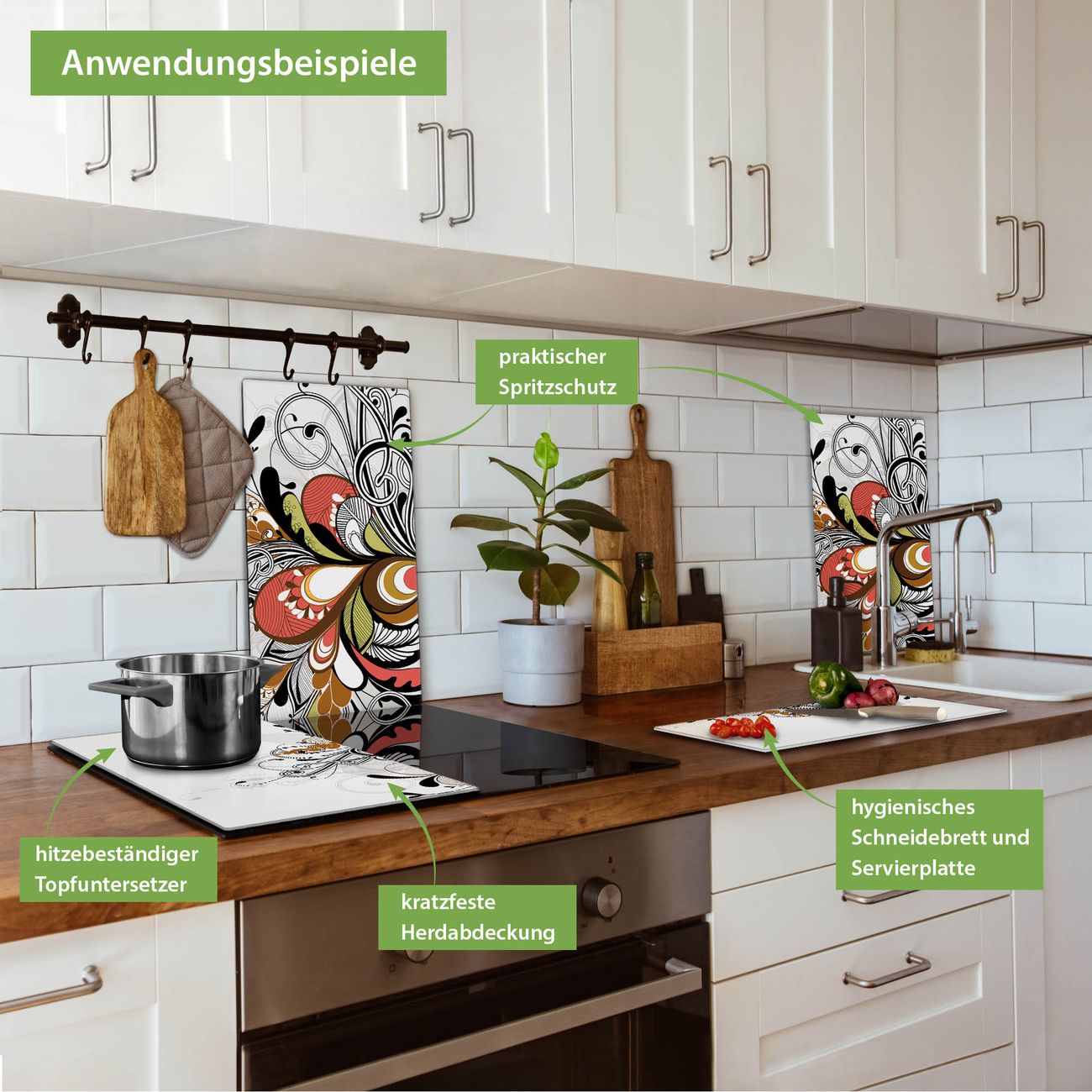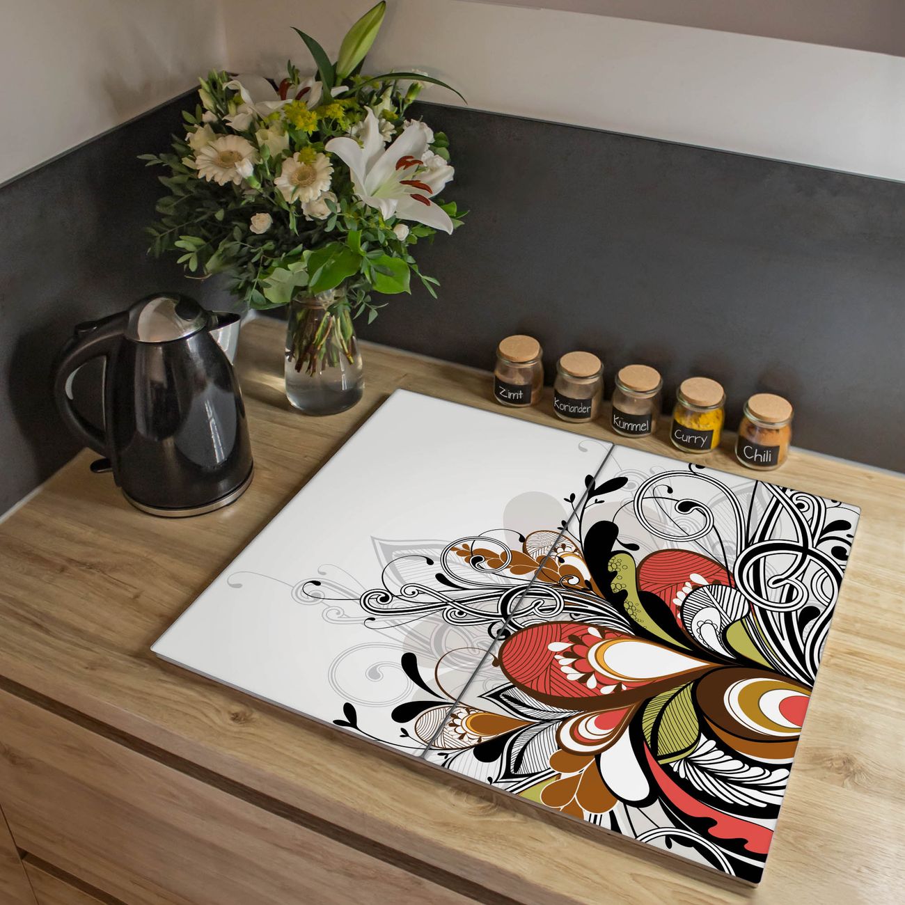 VIELSEITIG: Die Ceranfeldabdeckung ist vielseitig einsetzbar: ob als Spritzschutz hinter dem Herd für Ihre Küche oder als Glas Schneidebrett als hygienische und geruchsneutrale Unterlage. Sie können ebenfalls heiße Töpfe und Pfannen bis 100°C auf der Herdplattenabdeckung abstellen. Sie erhalten ein Multitalent für Ihre Küche. Die banjado Herdabdeckplatte aus Glas mit Motiv Ornament 2 verdeckt mit einem schönen Motiv Ihr Ceranfeld bzw. Ihren Induktionsherd. Die Herdabdeckplatte ist vielseitig einsetzbar und passt sich dabei Ihrem Einrichtungsstil an. DESIGN: Die Herdabdeckung Ornament 2 besteht aus hochwertigem, gehärtetem Glas mit einem unserer zahlreichen Motive. Sie haben die Wahl zwischen verschiedenen Maßen von einteiligen, zweiteiligen und einer dreiteiligen Herdabdeckung. Wählen Sie was zu Ihrer Einrichtung passt! DETAILS: Die Herdabdeckplatte ist vielseitig einsetzbar. Die Ecken sind für mehr Sicherheit dezent abgerundet, das Glas ist gehärtet. Sie erhalten separate Gummi Abstandshalter, damit Ihre Abdeckung rutschfest auf dem Herd steht. Diese können Sie frei positionieren, sodass die Herdabdeckung perfekt auf Ihrem Ceranfeld sitzt. BANJADO: Wir sind ein kleines Team aus dem Herzen von Sachsen und fertigen jeden Artikel nach Bestellung eigens für Sie an. Sie erhalten also keine preiswerte Importware, sondern Handarbeit. Auf Wunsch sind auch andere Farben und Größen möglich, kontakierten Sie uns gern.