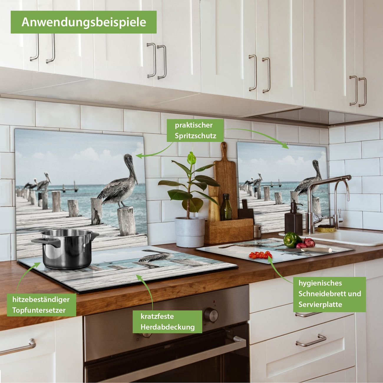 VIELSEITIG: Die Ceranfeldabdeckung ist vielseitig einsetzbar: ob als Spritzschutz hinter dem Herd für Ihre Küche oder als Glas Schneidebrett als hygienische und geruchsneutrale Unterlage. Sie können ebenfalls heiße Töpfe und Pfannen bis 100°C auf der Herdplattenabdeckung abstellen. Sie erhalten ein Multitalent für Ihre Küche. Die banjado Herdabdeckplatte aus Glas mit Motiv Pelikane verdeckt mit einem schönen Motiv Ihr Ceranfeld bzw. Ihren Induktionsherd. Die Herdabdeckplatte ist vielseitig einsetzbar und passt sich dabei Ihrem Einrichtungsstil an. DESIGN: Die Herdabdeckung Pelikane besteht aus hochwertigem, gehärtetem Glas mit einem unserer zahlreichen Motive. Sie haben die Wahl zwischen verschiedenen Maßen von einteiligen, zweiteiligen und einer dreiteiligen Herdabdeckung. Wählen Sie was zu Ihrer Einrichtung passt! DETAILS: Die Herdabdeckplatte ist vielseitig einsetzbar. Die Ecken sind für mehr Sicherheit dezent abgerundet, das Glas ist gehärtet. Sie erhalten separate Gummi Abstandshalter, damit Ihre Abdeckung rutschfest auf dem Herd steht. Diese können Sie frei positionieren, sodass die Herdabdeckung perfekt auf Ihrem Ceranfeld sitzt. BANJADO: Wir sind ein kleines Team aus dem Herzen von Sachsen und fertigen jeden Artikel nach Bestellung eigens für Sie an. Sie erhalten also keine preiswerte Importware, sondern Handarbeit. Auf Wunsch sind auch andere Farben und Größen möglich, kontakierten Sie uns gern.