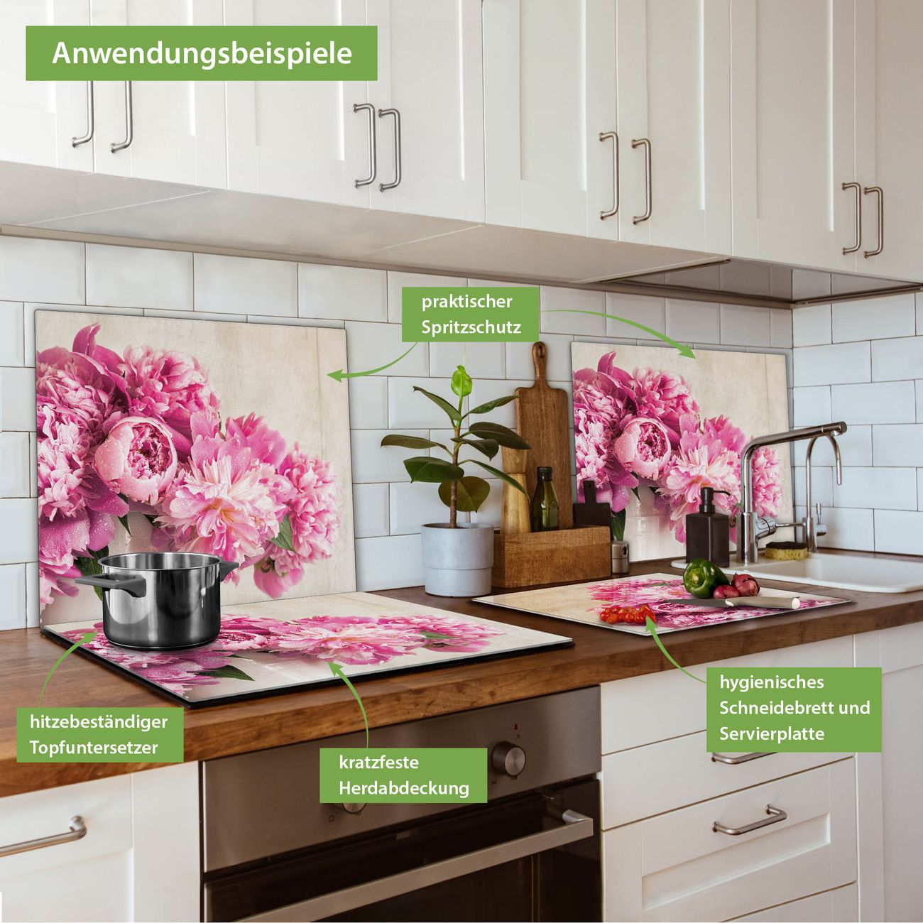 VIELSEITIG: Die Ceranfeldabdeckung ist vielseitig einsetzbar: ob als Spritzschutz hinter dem Herd für Ihre Küche oder als Glas Schneidebrett als hygienische und geruchsneutrale Unterlage. Sie können ebenfalls heiße Töpfe und Pfannen bis 100°C auf der Herdplattenabdeckung abstellen. Sie erhalten ein Multitalent für Ihre Küche. Die banjado Herdabdeckplatte aus Glas mit Motiv Pfingstrose verdeckt mit einem schönen Motiv Ihr Ceranfeld bzw. Ihren Induktionsherd. Die Herdabdeckplatte ist vielseitig einsetzbar und passt sich dabei Ihrem Einrichtungsstil an. DESIGN: Die Herdabdeckung Pfingstrose besteht aus hochwertigem, gehärtetem Glas mit einem unserer zahlreichen Motive. Sie haben die Wahl zwischen verschiedenen Maßen von einteiligen, zweiteiligen und einer dreiteiligen Herdabdeckung. Wählen Sie was zu Ihrer Einrichtung passt! DETAILS: Die Herdabdeckplatte ist vielseitig einsetzbar. Die Ecken sind für mehr Sicherheit dezent abgerundet, das Glas ist gehärtet. Sie erhalten separate Gummi Abstandshalter, damit Ihre Abdeckung rutschfest auf dem Herd steht. Diese können Sie frei positionieren, sodass die Herdabdeckung perfekt auf Ihrem Ceranfeld sitzt. BANJADO: Wir sind ein kleines Team aus dem Herzen von Sachsen und fertigen jeden Artikel nach Bestellung eigens für Sie an. Sie erhalten also keine preiswerte Importware, sondern Handarbeit. Auf Wunsch sind auch andere Farben und Größen möglich, kontakierten Sie uns gern.