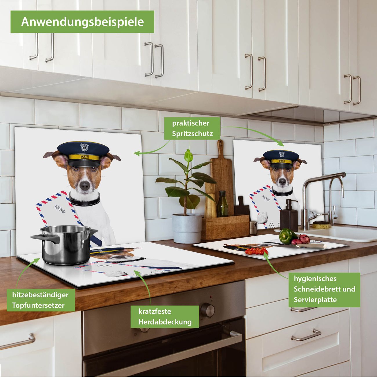 VIELSEITIG: Die Ceranfeldabdeckung ist vielseitig einsetzbar: ob als Spritzschutz hinter dem Herd für Ihre Küche oder als Glas Schneidebrett als hygienische und geruchsneutrale Unterlage. Sie können ebenfalls heiße Töpfe und Pfannen bis 100°C auf der Herdplattenabdeckung abstellen. Sie erhalten ein Multitalent für Ihre Küche. Die banjado Herdabdeckplatte aus Glas mit Motiv Postbote Jack Russel verdeckt mit einem schönen Motiv Ihr Ceranfeld bzw. Ihren Induktionsherd. Die Herdabdeckplatte ist vielseitig einsetzbar und passt sich dabei Ihrem Einrichtungsstil an. DESIGN: Die Herdabdeckung Postbote Jack Russel besteht aus hochwertigem, gehärtetem Glas mit einem unserer zahlreichen Motive. Sie haben die Wahl zwischen verschiedenen Maßen von einteiligen, zweiteiligen und einer dreiteiligen Herdabdeckung. Wählen Sie was zu Ihrer Einrichtung passt! DETAILS: Die Herdabdeckplatte ist vielseitig einsetzbar. Die Ecken sind für mehr Sicherheit dezent abgerundet, das Glas ist gehärtet. Sie erhalten separate Gummi Abstandshalter, damit Ihre Abdeckung rutschfest auf dem Herd steht. Diese können Sie frei positionieren, sodass die Herdabdeckung perfekt auf Ihrem Ceranfeld sitzt. BANJADO: Wir sind ein kleines Team aus dem Herzen von Sachsen und fertigen jeden Artikel nach Bestellung eigens für Sie an. Sie erhalten also keine preiswerte Importware, sondern Handarbeit. Auf Wunsch sind auch andere Farben und Größen möglich, kontakierten Sie uns gern.