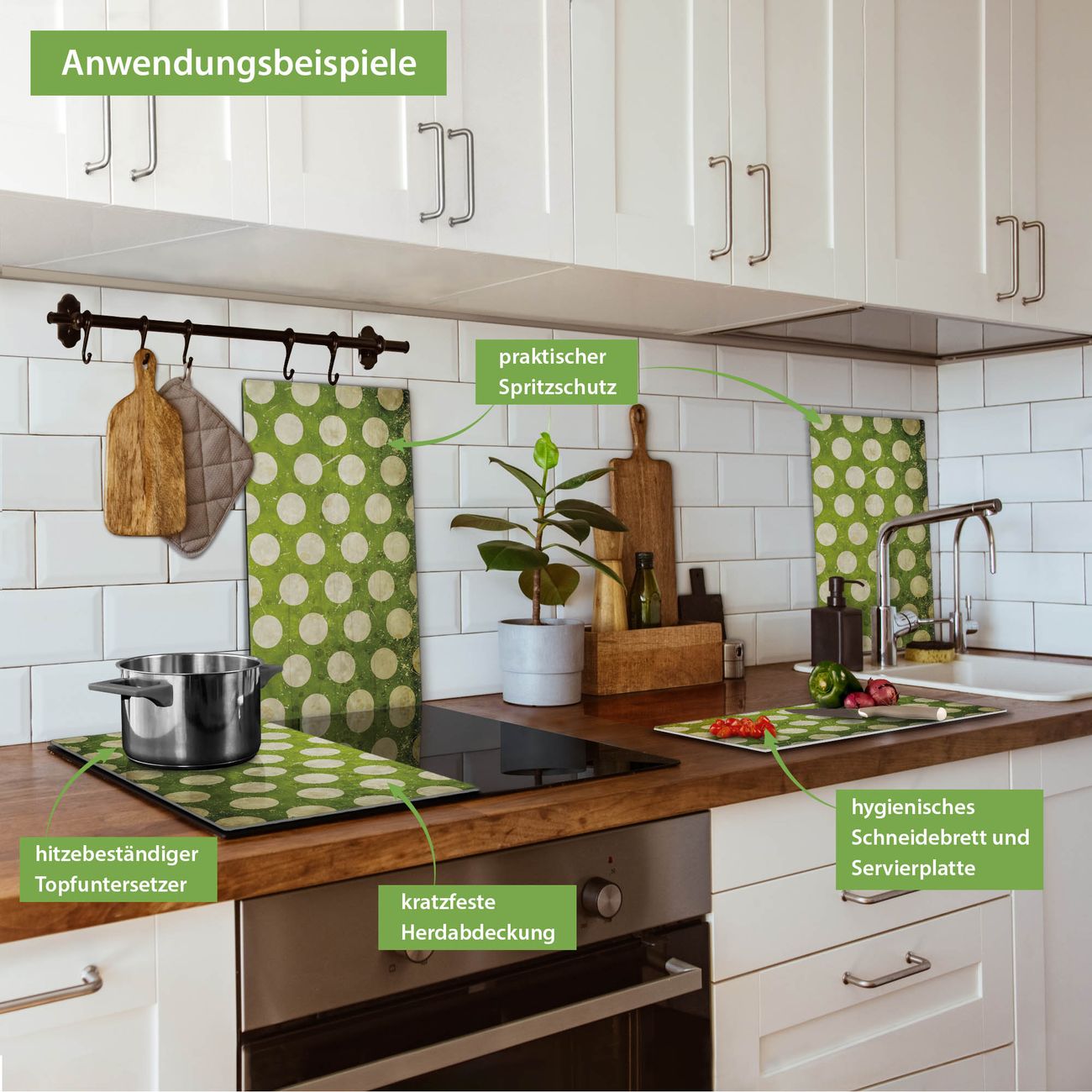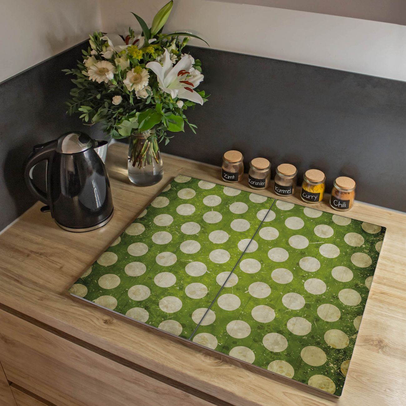 VIELSEITIG: Die Ceranfeldabdeckung ist vielseitig einsetzbar: ob als Spritzschutz hinter dem Herd für Ihre Küche oder als Glas Schneidebrett als hygienische und geruchsneutrale Unterlage. Sie können ebenfalls heiße Töpfe und Pfannen bis 100°C auf der Herdplattenabdeckung abstellen. Sie erhalten ein Multitalent für Ihre Küche. Die banjado Herdabdeckplatte aus Glas mit Motiv Punkte Grün Vintage verdeckt mit einem schönen Motiv Ihr Ceranfeld bzw. Ihren Induktionsherd. Die Herdabdeckplatte ist vielseitig einsetzbar und passt sich dabei Ihrem Einrichtungsstil an. DESIGN: Die Herdabdeckung Punkte Grün Vintage besteht aus hochwertigem, gehärtetem Glas mit einem unserer zahlreichen Motive. Sie haben die Wahl zwischen verschiedenen Maßen von einteiligen, zweiteiligen und einer dreiteiligen Herdabdeckung. Wählen Sie was zu Ihrer Einrichtung passt! DETAILS: Die Herdabdeckplatte ist vielseitig einsetzbar. Die Ecken sind für mehr Sicherheit dezent abgerundet, das Glas ist gehärtet. Sie erhalten separate Gummi Abstandshalter, damit Ihre Abdeckung rutschfest auf dem Herd steht. Diese können Sie frei positionieren, sodass die Herdabdeckung perfekt auf Ihrem Ceranfeld sitzt. BANJADO: Wir sind ein kleines Team aus dem Herzen von Sachsen und fertigen jeden Artikel nach Bestellung eigens für Sie an. Sie erhalten also keine preiswerte Importware, sondern Handarbeit. Auf Wunsch sind auch andere Farben und Größen möglich, kontakierten Sie uns gern.