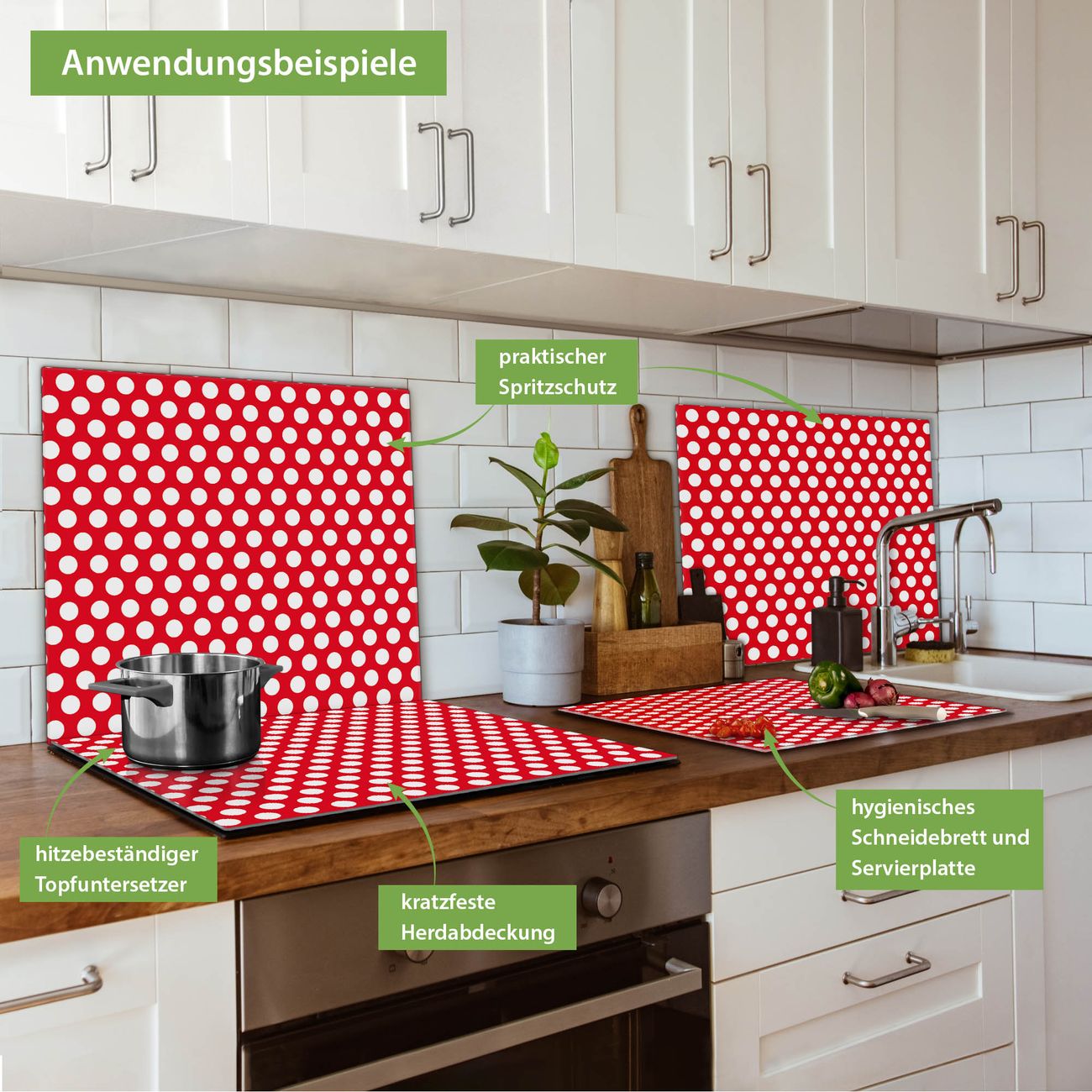 VIELSEITIG: Die Ceranfeldabdeckung ist vielseitig einsetzbar: ob als Spritzschutz hinter dem Herd für Ihre Küche oder als Glas Schneidebrett als hygienische und geruchsneutrale Unterlage. Sie können ebenfalls heiße Töpfe und Pfannen bis 100°C auf der Herdplattenabdeckung abstellen. Sie erhalten ein Multitalent für Ihre Küche. Die banjado Herdabdeckplatte aus Glas mit Motiv Punkte Rot verdeckt mit einem schönen Motiv Ihr Ceranfeld bzw. Ihren Induktionsherd. Die Herdabdeckplatte ist vielseitig einsetzbar und passt sich dabei Ihrem Einrichtungsstil an. DESIGN: Die Herdabdeckung Punkte Rot besteht aus hochwertigem, gehärtetem Glas mit einem unserer zahlreichen Motive. Sie haben die Wahl zwischen verschiedenen Maßen von einteiligen, zweiteiligen und einer dreiteiligen Herdabdeckung. Wählen Sie was zu Ihrer Einrichtung passt! DETAILS: Die Herdabdeckplatte ist vielseitig einsetzbar. Die Ecken sind für mehr Sicherheit dezent abgerundet, das Glas ist gehärtet. Sie erhalten separate Gummi Abstandshalter, damit Ihre Abdeckung rutschfest auf dem Herd steht. Diese können Sie frei positionieren, sodass die Herdabdeckung perfekt auf Ihrem Ceranfeld sitzt. BANJADO: Wir sind ein kleines Team aus dem Herzen von Sachsen und fertigen jeden Artikel nach Bestellung eigens für Sie an. Sie erhalten also keine preiswerte Importware, sondern Handarbeit. Auf Wunsch sind auch andere Farben und Größen möglich, kontakierten Sie uns gern.