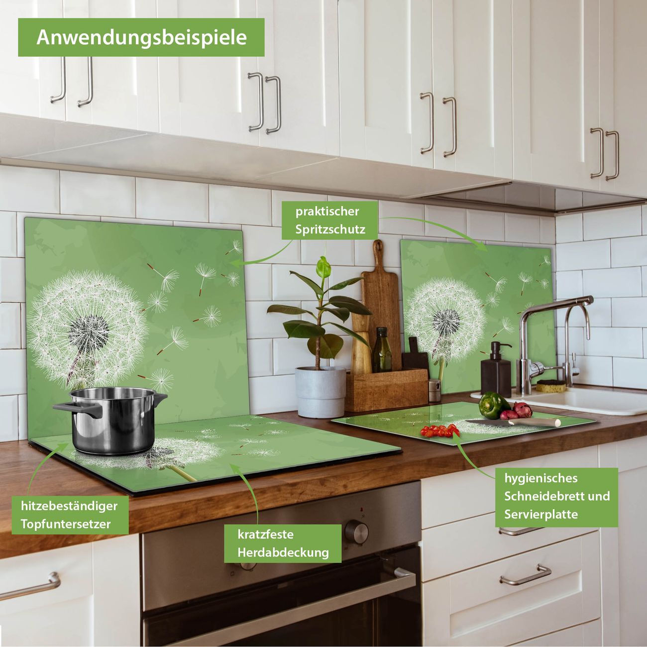 VIELSEITIG: Die Ceranfeldabdeckung ist vielseitig einsetzbar: ob als Spritzschutz hinter dem Herd für Ihre Küche oder als Glas Schneidebrett als hygienische und geruchsneutrale Unterlage. Sie können ebenfalls heiße Töpfe und Pfannen bis 100°C auf der Herdplattenabdeckung abstellen. Sie erhalten ein Multitalent für Ihre Küche. Die banjado Herdabdeckplatte aus Glas mit Motiv Pusteblume 3 verdeckt mit einem schönen Motiv Ihr Ceranfeld bzw. Ihren Induktionsherd. Die Herdabdeckplatte ist vielseitig einsetzbar und passt sich dabei Ihrem Einrichtungsstil an. DESIGN: Die Herdabdeckung Pusteblume 3 besteht aus hochwertigem, gehärtetem Glas mit einem unserer zahlreichen Motive. Sie haben die Wahl zwischen verschiedenen Maßen von einteiligen, zweiteiligen und einer dreiteiligen Herdabdeckung. Wählen Sie was zu Ihrer Einrichtung passt! DETAILS: Die Herdabdeckplatte ist vielseitig einsetzbar. Die Ecken sind für mehr Sicherheit dezent abgerundet, das Glas ist gehärtet. Sie erhalten separate Gummi Abstandshalter, damit Ihre Abdeckung rutschfest auf dem Herd steht. Diese können Sie frei positionieren, sodass die Herdabdeckung perfekt auf Ihrem Ceranfeld sitzt. BANJADO: Wir sind ein kleines Team aus dem Herzen von Sachsen und fertigen jeden Artikel nach Bestellung eigens für Sie an. Sie erhalten also keine preiswerte Importware, sondern Handarbeit. Auf Wunsch sind auch andere Farben und Größen möglich, kontakierten Sie uns gern.