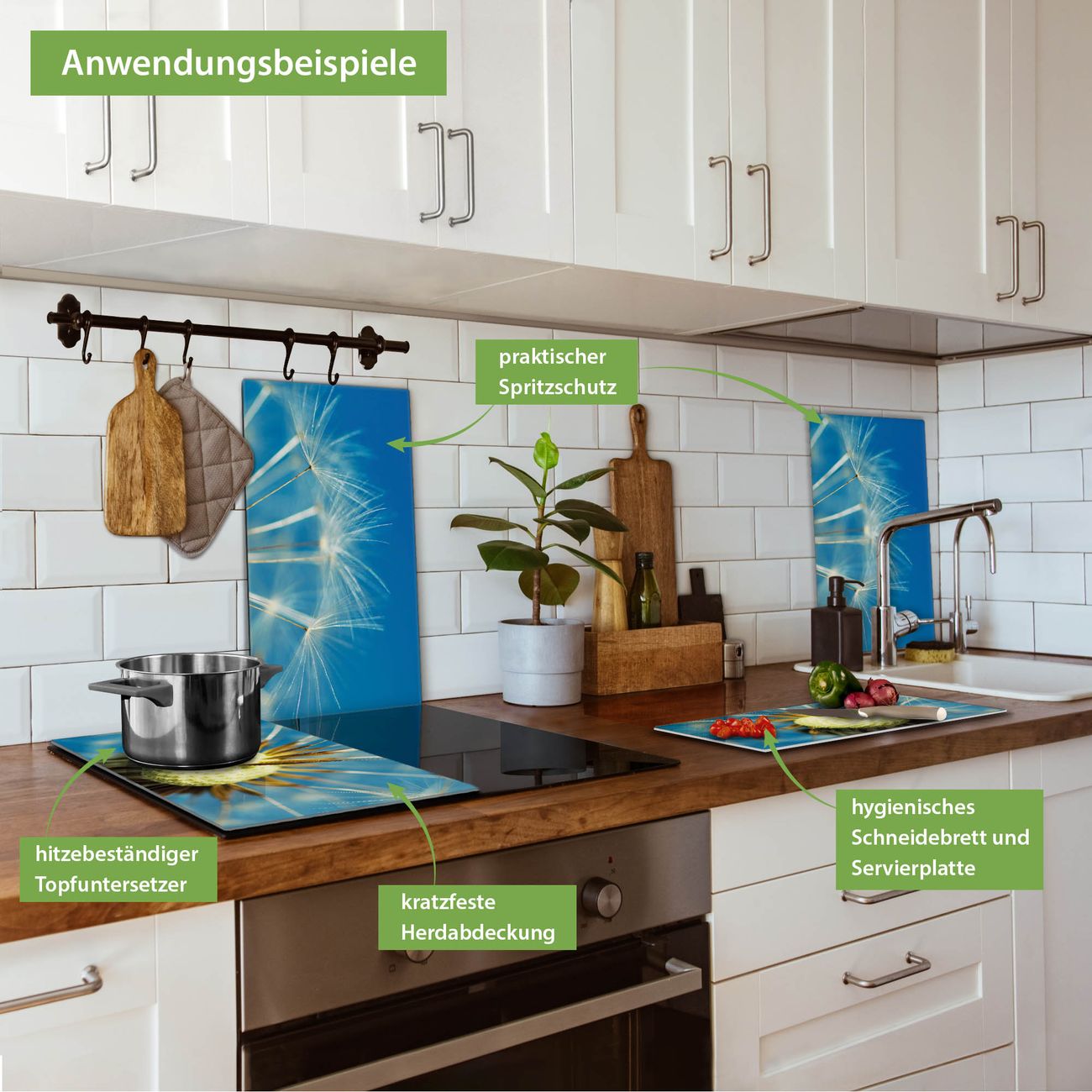 VIELSEITIG: Die Ceranfeldabdeckung ist vielseitig einsetzbar: ob als Spritzschutz hinter dem Herd für Ihre Küche oder als Glas Schneidebrett als hygienische und geruchsneutrale Unterlage. Sie können ebenfalls heiße Töpfe und Pfannen bis 100°C auf der Herdplattenabdeckung abstellen. Sie erhalten ein Multitalent für Ihre Küche. Die banjado Herdabdeckplatte aus Glas mit Motiv Pusteblume Detail verdeckt mit einem schönen Motiv Ihr Ceranfeld bzw. Ihren Induktionsherd. Die Herdabdeckplatte ist vielseitig einsetzbar und passt sich dabei Ihrem Einrichtungsstil an. DESIGN: Die Herdabdeckung Pusteblume Detail besteht aus hochwertigem, gehärtetem Glas mit einem unserer zahlreichen Motive. Sie haben die Wahl zwischen verschiedenen Maßen von einteiligen, zweiteiligen und einer dreiteiligen Herdabdeckung. Wählen Sie was zu Ihrer Einrichtung passt! DETAILS: Die Herdabdeckplatte ist vielseitig einsetzbar. Die Ecken sind für mehr Sicherheit dezent abgerundet, das Glas ist gehärtet. Sie erhalten separate Gummi Abstandshalter, damit Ihre Abdeckung rutschfest auf dem Herd steht. Diese können Sie frei positionieren, sodass die Herdabdeckung perfekt auf Ihrem Ceranfeld sitzt. BANJADO: Wir sind ein kleines Team aus dem Herzen von Sachsen und fertigen jeden Artikel nach Bestellung eigens für Sie an. Sie erhalten also keine preiswerte Importware, sondern Handarbeit. Auf Wunsch sind auch andere Farben und Größen möglich, kontakierten Sie uns gern.