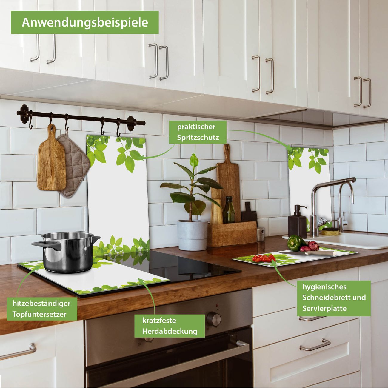 VIELSEITIG: Die Ceranfeldabdeckung ist vielseitig einsetzbar: ob als Spritzschutz hinter dem Herd für Ihre Küche oder als Glas Schneidebrett als hygienische und geruchsneutrale Unterlage. Sie können ebenfalls heiße Töpfe und Pfannen bis 100°C auf der Herdplattenabdeckung abstellen. Sie erhalten ein Multitalent für Ihre Küche. Die banjado Herdabdeckplatte aus Glas mit Motiv Rahmen Blätter verdeckt mit einem schönen Motiv Ihr Ceranfeld bzw. Ihren Induktionsherd. Die Herdabdeckplatte ist vielseitig einsetzbar und passt sich dabei Ihrem Einrichtungsstil an. DESIGN: Die Herdabdeckung Rahmen Blätter besteht aus hochwertigem, gehärtetem Glas mit einem unserer zahlreichen Motive. Sie haben die Wahl zwischen verschiedenen Maßen von einteiligen, zweiteiligen und einer dreiteiligen Herdabdeckung. Wählen Sie was zu Ihrer Einrichtung passt! DETAILS: Die Herdabdeckplatte ist vielseitig einsetzbar. Die Ecken sind für mehr Sicherheit dezent abgerundet, das Glas ist gehärtet. Sie erhalten separate Gummi Abstandshalter, damit Ihre Abdeckung rutschfest auf dem Herd steht. Diese können Sie frei positionieren, sodass die Herdabdeckung perfekt auf Ihrem Ceranfeld sitzt. BANJADO: Wir sind ein kleines Team aus dem Herzen von Sachsen und fertigen jeden Artikel nach Bestellung eigens für Sie an. Sie erhalten also keine preiswerte Importware, sondern Handarbeit. Auf Wunsch sind auch andere Farben und Größen möglich, kontakierten Sie uns gern.