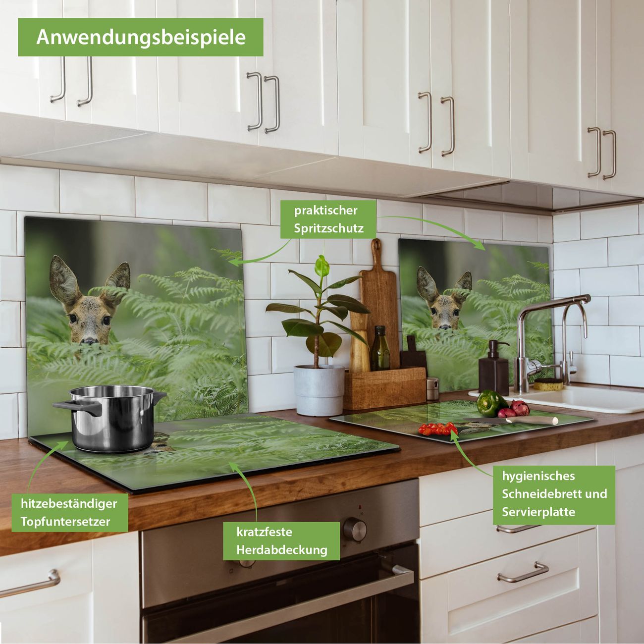 VIELSEITIG: Die Ceranfeldabdeckung ist vielseitig einsetzbar: ob als Spritzschutz hinter dem Herd für Ihre Küche oder als Glas Schneidebrett als hygienische und geruchsneutrale Unterlage. Sie können ebenfalls heiße Töpfe und Pfannen bis 100°C auf der Herdplattenabdeckung abstellen. Sie erhalten ein Multitalent für Ihre Küche. Die banjado Herdabdeckplatte aus Glas mit Motiv Reh verdeckt mit einem schönen Motiv Ihr Ceranfeld bzw. Ihren Induktionsherd. Die Herdabdeckplatte ist vielseitig einsetzbar und passt sich dabei Ihrem Einrichtungsstil an. DESIGN: Die Herdabdeckung Reh besteht aus hochwertigem, gehärtetem Glas mit einem unserer zahlreichen Motive. Sie haben die Wahl zwischen verschiedenen Maßen von einteiligen, zweiteiligen und einer dreiteiligen Herdabdeckung. Wählen Sie was zu Ihrer Einrichtung passt! DETAILS: Die Herdabdeckplatte ist vielseitig einsetzbar. Die Ecken sind für mehr Sicherheit dezent abgerundet, das Glas ist gehärtet. Sie erhalten separate Gummi Abstandshalter, damit Ihre Abdeckung rutschfest auf dem Herd steht. Diese können Sie frei positionieren, sodass die Herdabdeckung perfekt auf Ihrem Ceranfeld sitzt. BANJADO: Wir sind ein kleines Team aus dem Herzen von Sachsen und fertigen jeden Artikel nach Bestellung eigens für Sie an. Sie erhalten also keine preiswerte Importware, sondern Handarbeit. Auf Wunsch sind auch andere Farben und Größen möglich, kontakierten Sie uns gern.