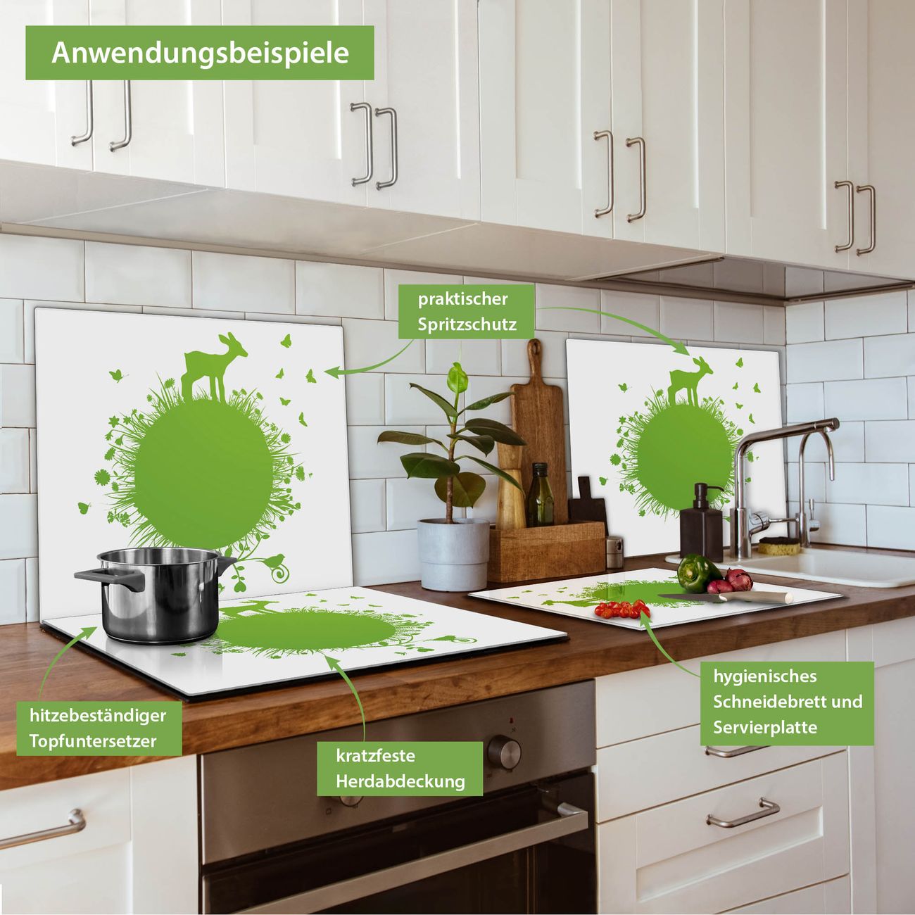 VIELSEITIG: Die Ceranfeldabdeckung ist vielseitig einsetzbar: ob als Spritzschutz hinter dem Herd für Ihre Küche oder als Glas Schneidebrett als hygienische und geruchsneutrale Unterlage. Sie können ebenfalls heiße Töpfe und Pfannen bis 100°C auf der Herdplattenabdeckung abstellen. Sie erhalten ein Multitalent für Ihre Küche. Die banjado Herdabdeckplatte aus Glas mit Motiv Rehkitz verdeckt mit einem schönen Motiv Ihr Ceranfeld bzw. Ihren Induktionsherd. Die Herdabdeckplatte ist vielseitig einsetzbar und passt sich dabei Ihrem Einrichtungsstil an. DESIGN: Die Herdabdeckung Rehkitz besteht aus hochwertigem, gehärtetem Glas mit einem unserer zahlreichen Motive. Sie haben die Wahl zwischen verschiedenen Maßen von einteiligen, zweiteiligen und einer dreiteiligen Herdabdeckung. Wählen Sie was zu Ihrer Einrichtung passt! DETAILS: Die Herdabdeckplatte ist vielseitig einsetzbar. Die Ecken sind für mehr Sicherheit dezent abgerundet, das Glas ist gehärtet. Sie erhalten separate Gummi Abstandshalter, damit Ihre Abdeckung rutschfest auf dem Herd steht. Diese können Sie frei positionieren, sodass die Herdabdeckung perfekt auf Ihrem Ceranfeld sitzt. BANJADO: Wir sind ein kleines Team aus dem Herzen von Sachsen und fertigen jeden Artikel nach Bestellung eigens für Sie an. Sie erhalten also keine preiswerte Importware, sondern Handarbeit. Auf Wunsch sind auch andere Farben und Größen möglich, kontakierten Sie uns gern.