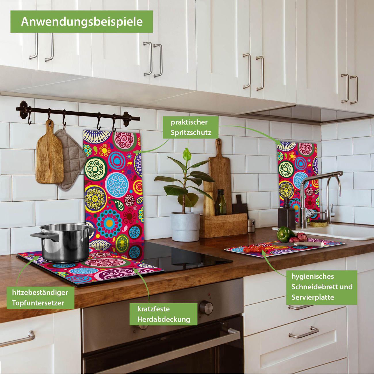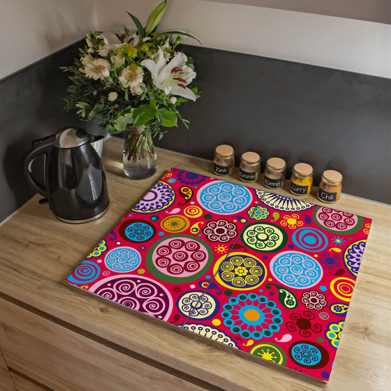 VIELSEITIG: Die Ceranfeldabdeckung ist vielseitig einsetzbar: ob als Spritzschutz hinter dem Herd für Ihre Küche oder als Glas Schneidebrett als hygienische und geruchsneutrale Unterlage. Sie können ebenfalls heiße Töpfe und Pfannen bis 100°C auf der Herdplattenabdeckung abstellen. Sie erhalten ein Multitalent für Ihre Küche. Die banjado Herdabdeckplatte aus Glas mit Motiv Retro Kreise verdeckt mit einem schönen Motiv Ihr Ceranfeld bzw. Ihren Induktionsherd. Die Herdabdeckplatte ist vielseitig einsetzbar und passt sich dabei Ihrem Einrichtungsstil an. DESIGN: Die Herdabdeckung Retro Kreise besteht aus hochwertigem, gehärtetem Glas mit einem unserer zahlreichen Motive. Sie haben die Wahl zwischen verschiedenen Maßen von einteiligen, zweiteiligen und einer dreiteiligen Herdabdeckung. Wählen Sie was zu Ihrer Einrichtung passt! DETAILS: Die Herdabdeckplatte ist vielseitig einsetzbar. Die Ecken sind für mehr Sicherheit dezent abgerundet, das Glas ist gehärtet. Sie erhalten separate Gummi Abstandshalter, damit Ihre Abdeckung rutschfest auf dem Herd steht. Diese können Sie frei positionieren, sodass die Herdabdeckung perfekt auf Ihrem Ceranfeld sitzt. BANJADO: Wir sind ein kleines Team aus dem Herzen von Sachsen und fertigen jeden Artikel nach Bestellung eigens für Sie an. Sie erhalten also keine preiswerte Importware, sondern Handarbeit. Auf Wunsch sind auch andere Farben und Größen möglich, kontakierten Sie uns gern.